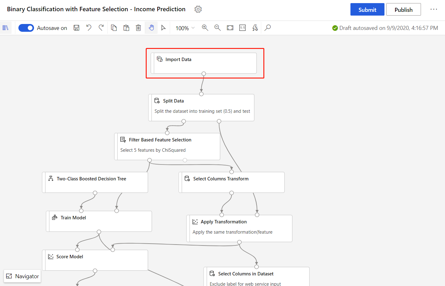 本文中使用的管道是 收入预测 示例管道的更改版本。 该管道使用导入数据组件,而不是用于演示如何使用自己的数据训练模型的示例数据集。