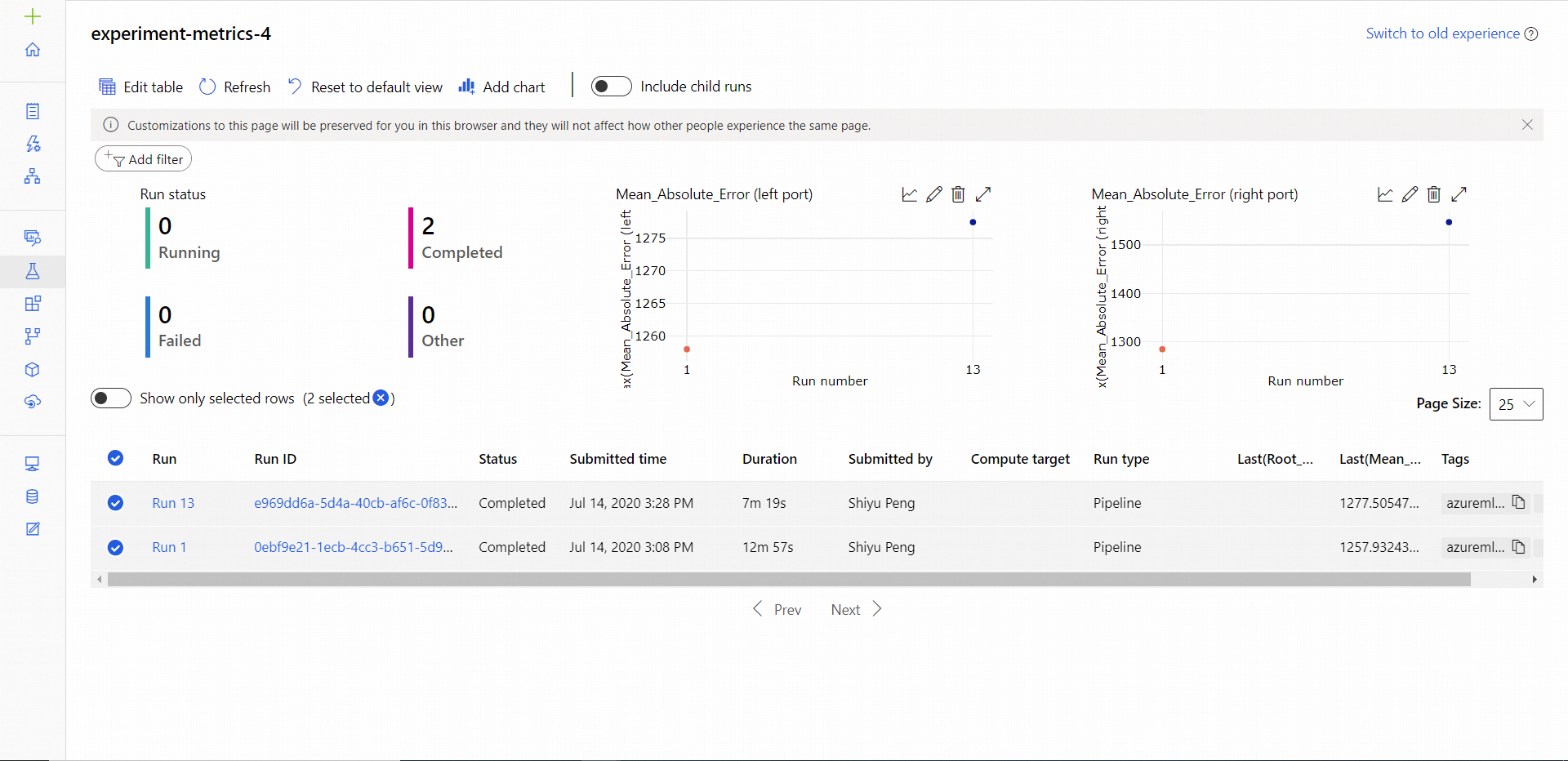 管道运行完成后,“试验”页中将显示 Mean_Absolute_Error。