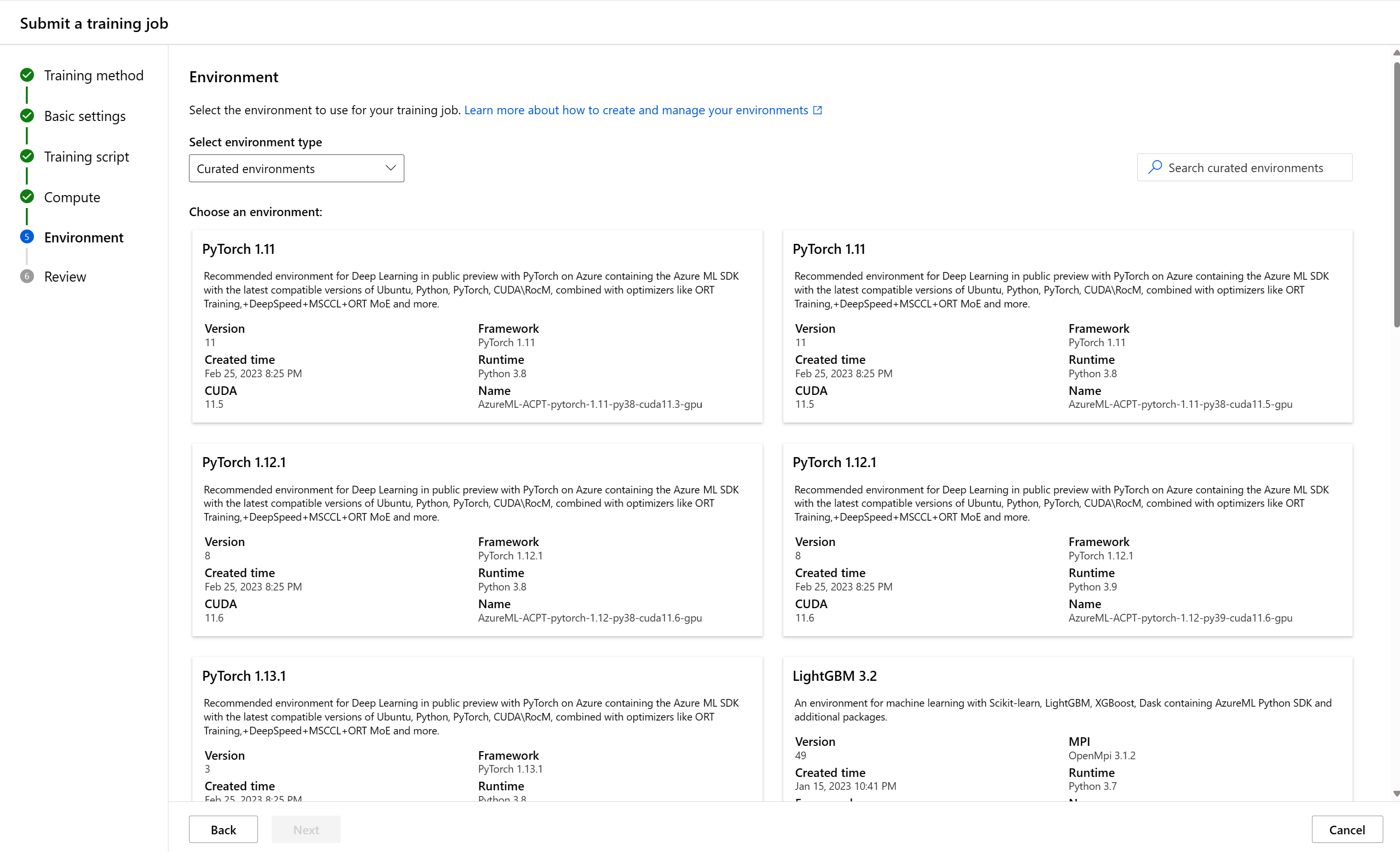 特选环境是 Azure 定义的、在常见 ML 工作负载中使用的 Python 包集合。 默认情况下,你有权访问工作区中的特选环境。 这些环境使用缓存的 Docker 映像,从而减少了作业准备开销。 “特选环境”页中显示的卡片显示每个环境的详细信息。 若要了解详细信息,请参阅 Azure 机器学习特选环境。