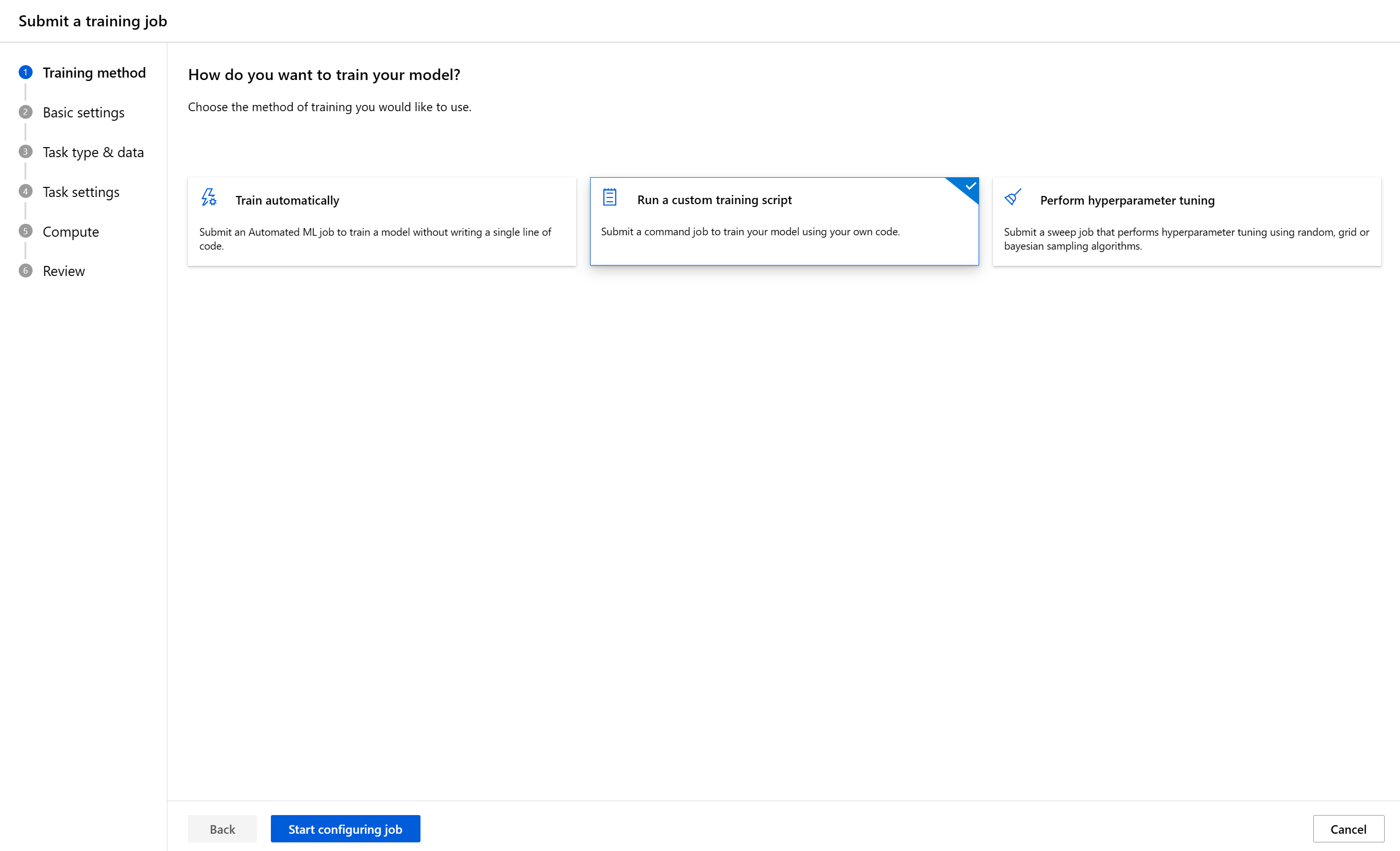 选择训练方法,然后选择 “开始配置作业 ”以打开提交表单。