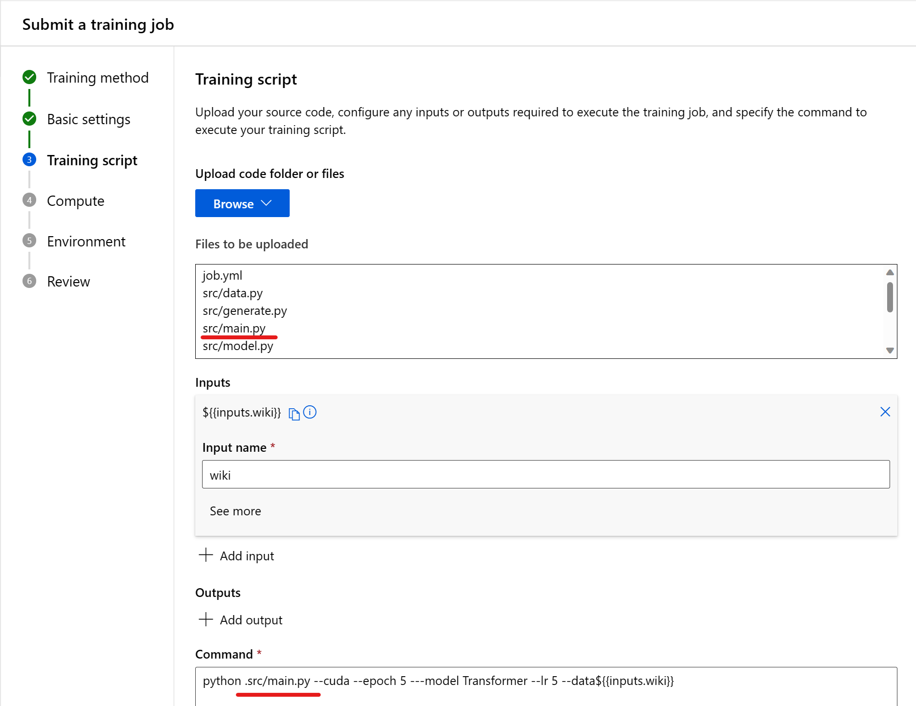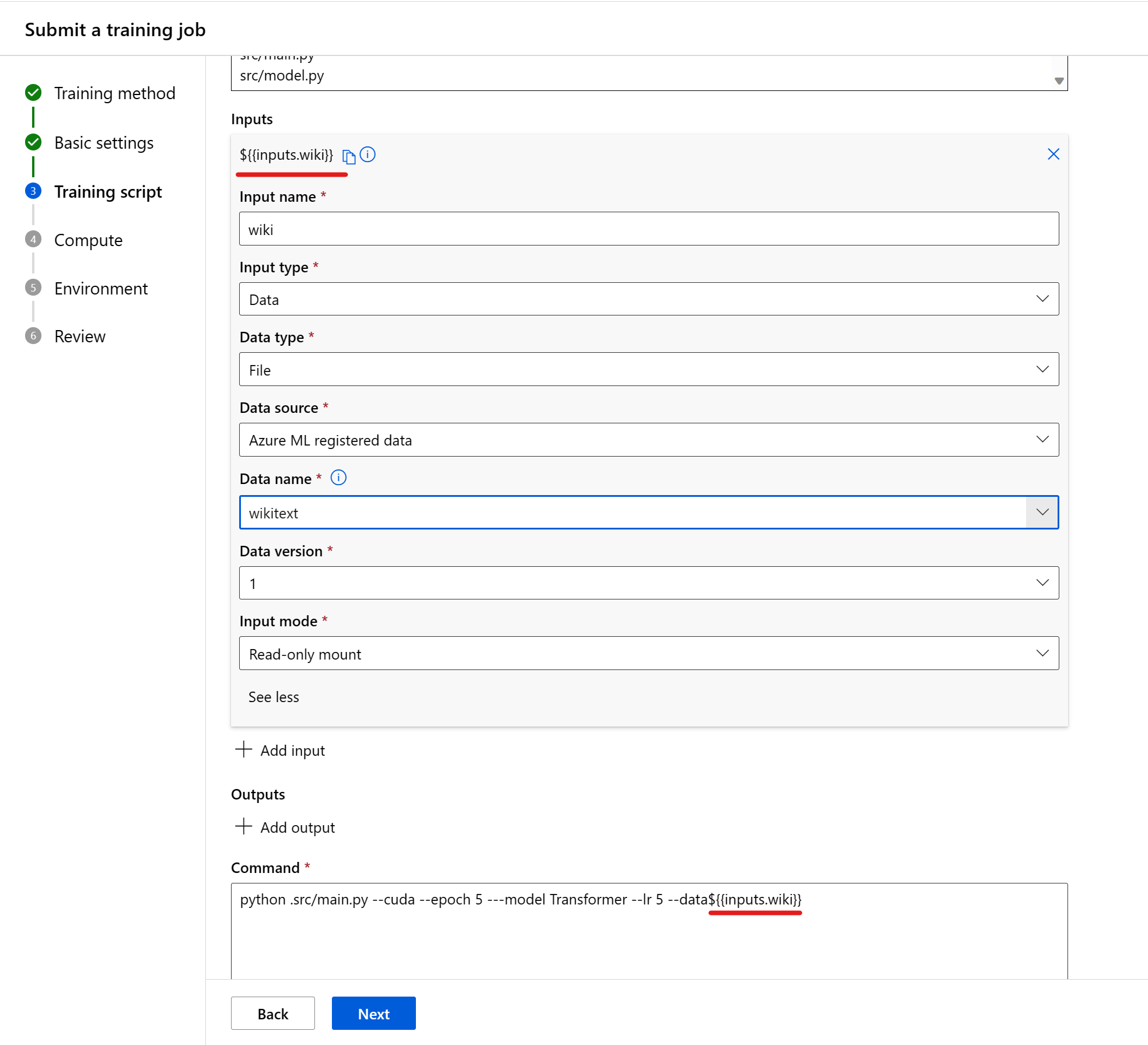 在命令中使用输入时,请指定输入名称。 若要指示输入变量,请使用 ${{inputs.input_name}} 格式。 例如,${{inputs.wiki}}。 然后,可以在命令中引用它,例如 --data ${{inputs.wiki}}。