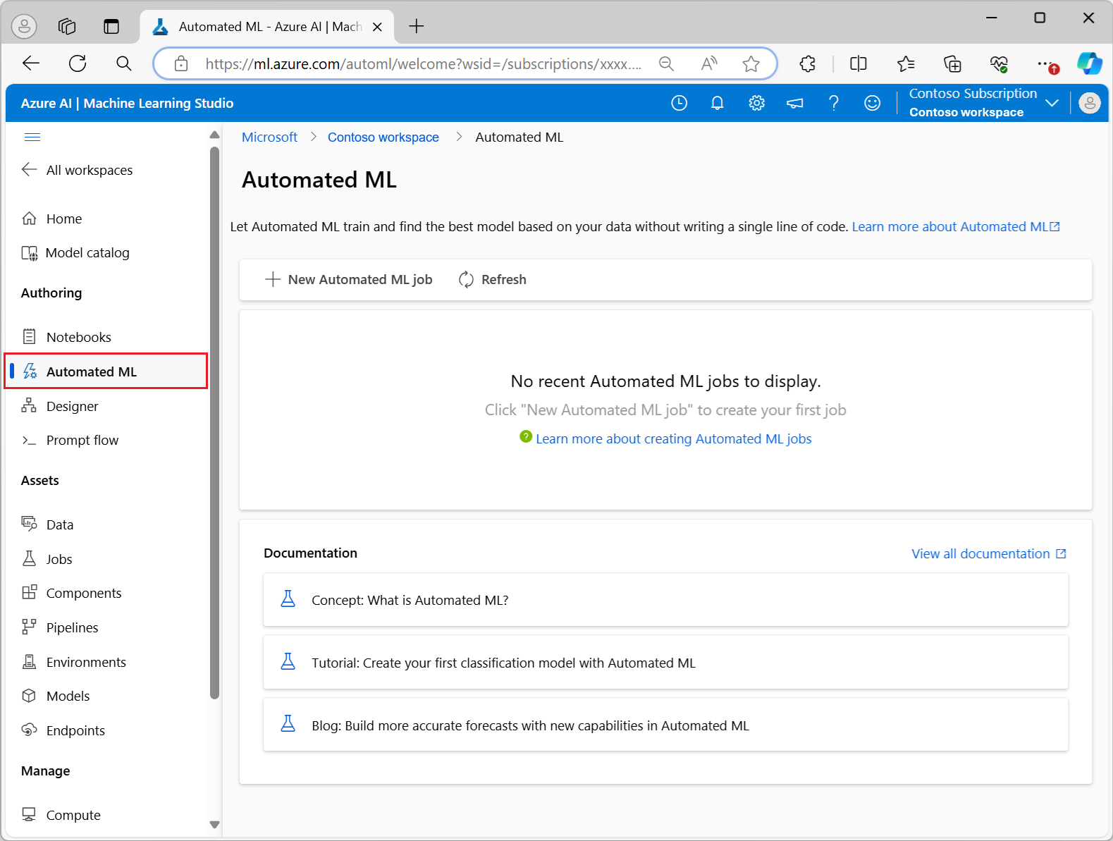首次在工作室中使用试验时,你会看到一个空列表和指向文档的链接。 如果不是,你会看到最近的自动化 ML 试验列表,包括使用 Azure 机器学习 SDK 创建的项。