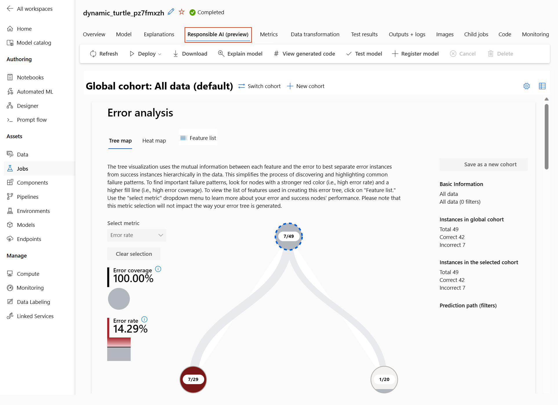 若要更好地了解模型,可以使用“负责任的 AI”仪表板查看有关它的各种见解。 通过此 UI,可以评估和调试最佳自动化 ML 模型。 负责任 AI 仪表板评估模型错误和公平性问题,通过评估训练和/或测试数据以及观察模型解释来诊断发生这些错误的原因。 这些见解有助于您与模型建立信任并通过审核流程。 无法为现有的自动化 ML 模型生成负责任 AI 仪表板。 只有在创建新的自动化 ML 作业时,才会为最佳推荐模型创建仪表板。 在为现有模型提供支持之前,用户应继续使用模型说明(预览版)。