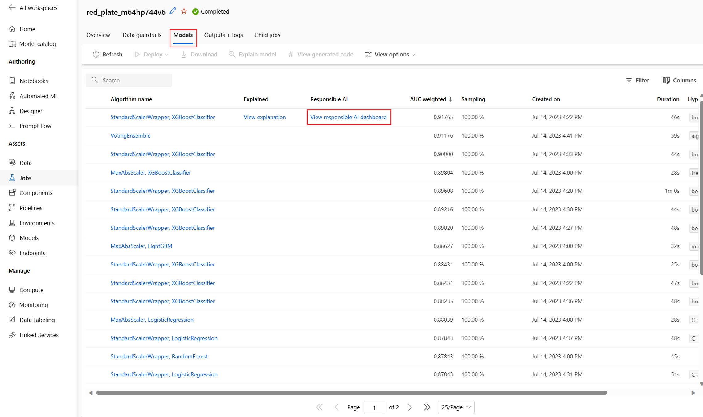 4. 该操作完成后,浏览到自动化 ML 作业的“模型”页,其中包含已训练模型的列表