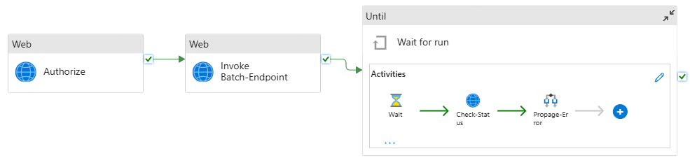 - 检查状态:这是一个 Web 活动,用于查询在“运行批处理终结点”活动中作为响应返回的作业资源状态。