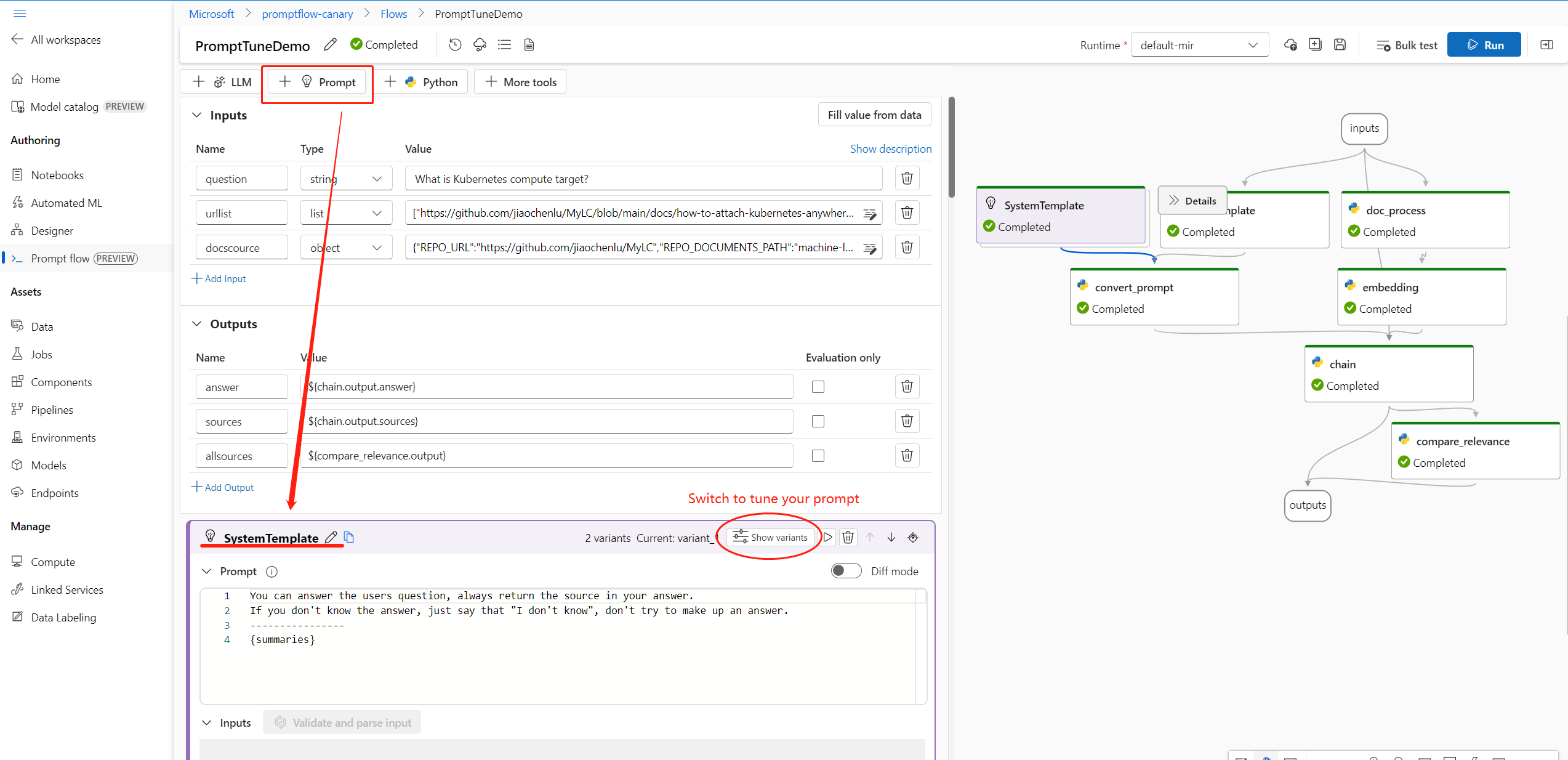 为了更好地管理试验,可以将代码转换为使用 Azure 机器学习 Python 和流中的提示工具。 将代码中的提示模板提取到提示节点中,并将剩余代码放在单个或多个 Python 节点或工具中。 此选项可帮助你通过运行变体来轻松优化提示,并可让你根据评估结果选择最佳提示。