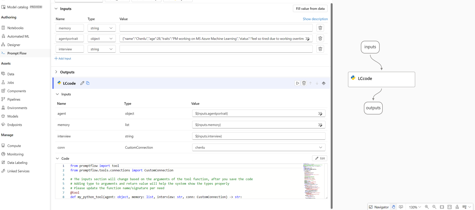 只要计算会话包含 langchain 包依赖项,所有 LangChain 代码就可以直接在流中的 Python 节点中运行。