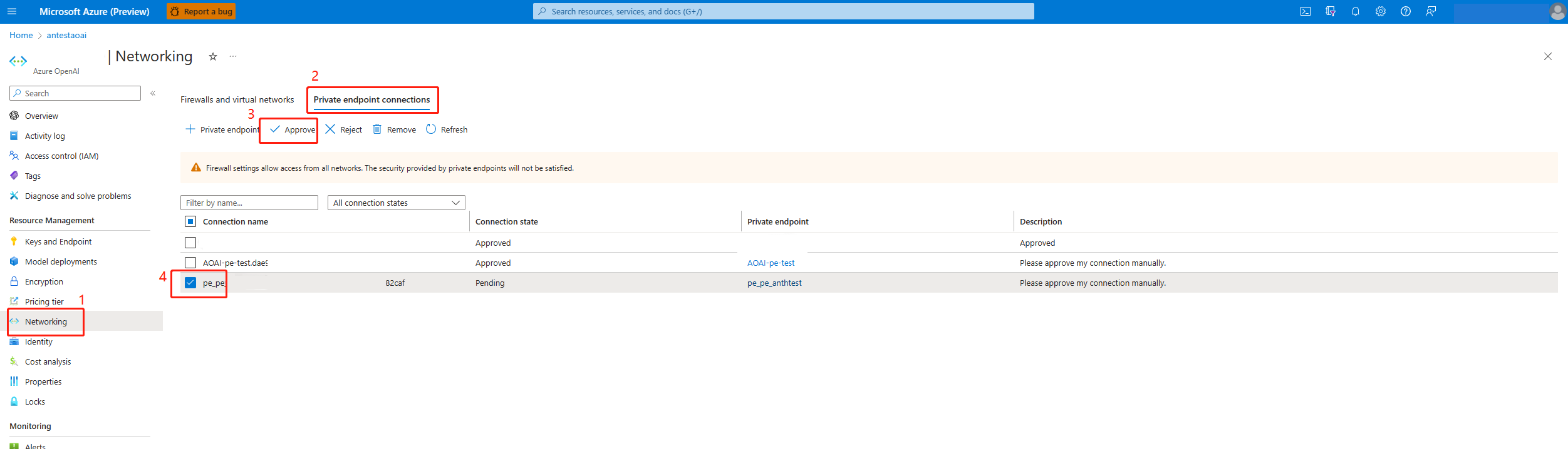 如果要与专用 Foundry 工具进行通信,需要向对应的资源添加用户定义的出站规则。 Azure 机器学习工作区使用自动批准在相关资源中创建专用终结点。 如果状态停滞在待处理状态,请转到相关资源手动批准专用终结点。