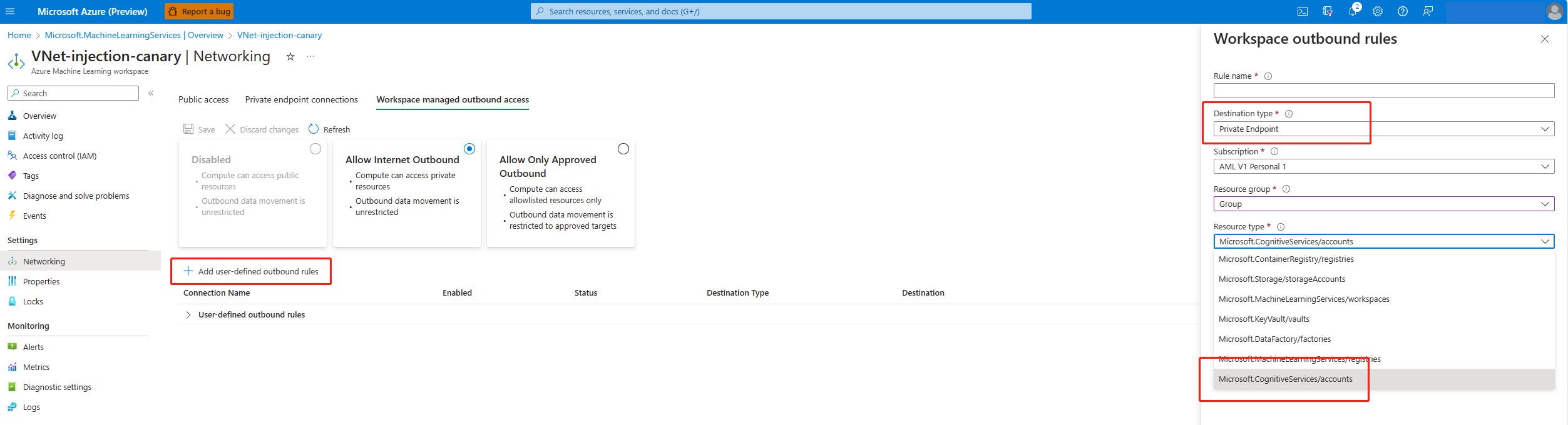 - 不支持在单个工作区中使用托管 vNet 和自带虚拟网络的组合。 此外,由于托管联机终结点仅受托管虚拟网络支持,因此无法在启用了自带虚拟网络的工作区中将提示流部署到托管联机终结点。
