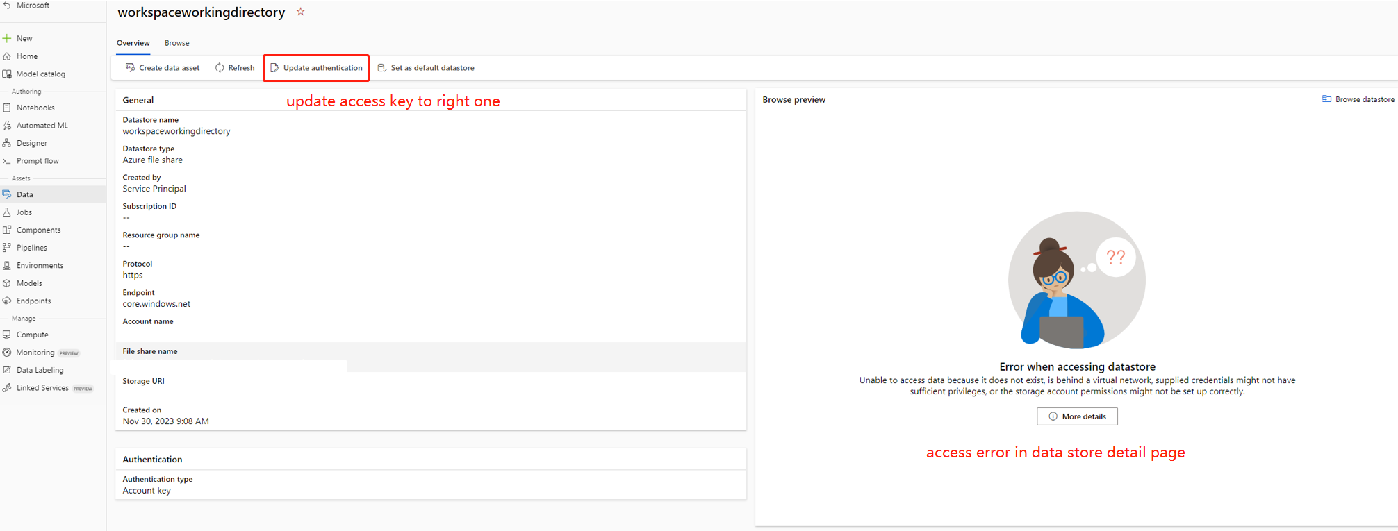 在某些情况下,数据存储中的帐户密钥与存储帐户不同步,可以尝试更新数据存储详细信息页中的帐户密钥以解决此问题。