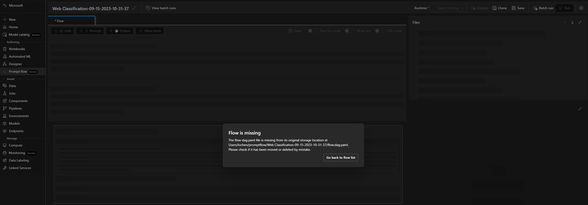 当更新流以获得代码优先体验时,如果流使用 Faiss 索引查找、矢量索引查找、矢量数据库查找或内容安全(文本)工具,则可能会遇到以下错误消息: