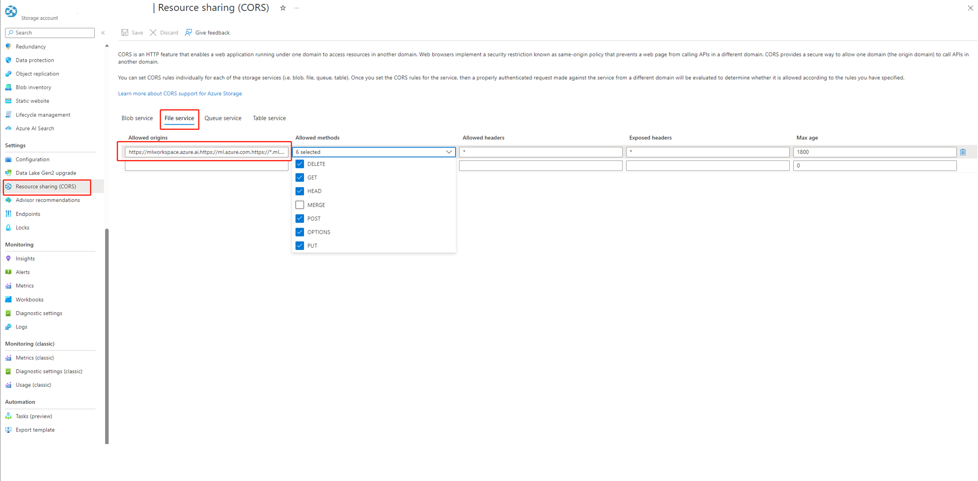 Resource sharing (CORS)下的“settings”,然后选择“File service”选项卡。 - 允许的源: