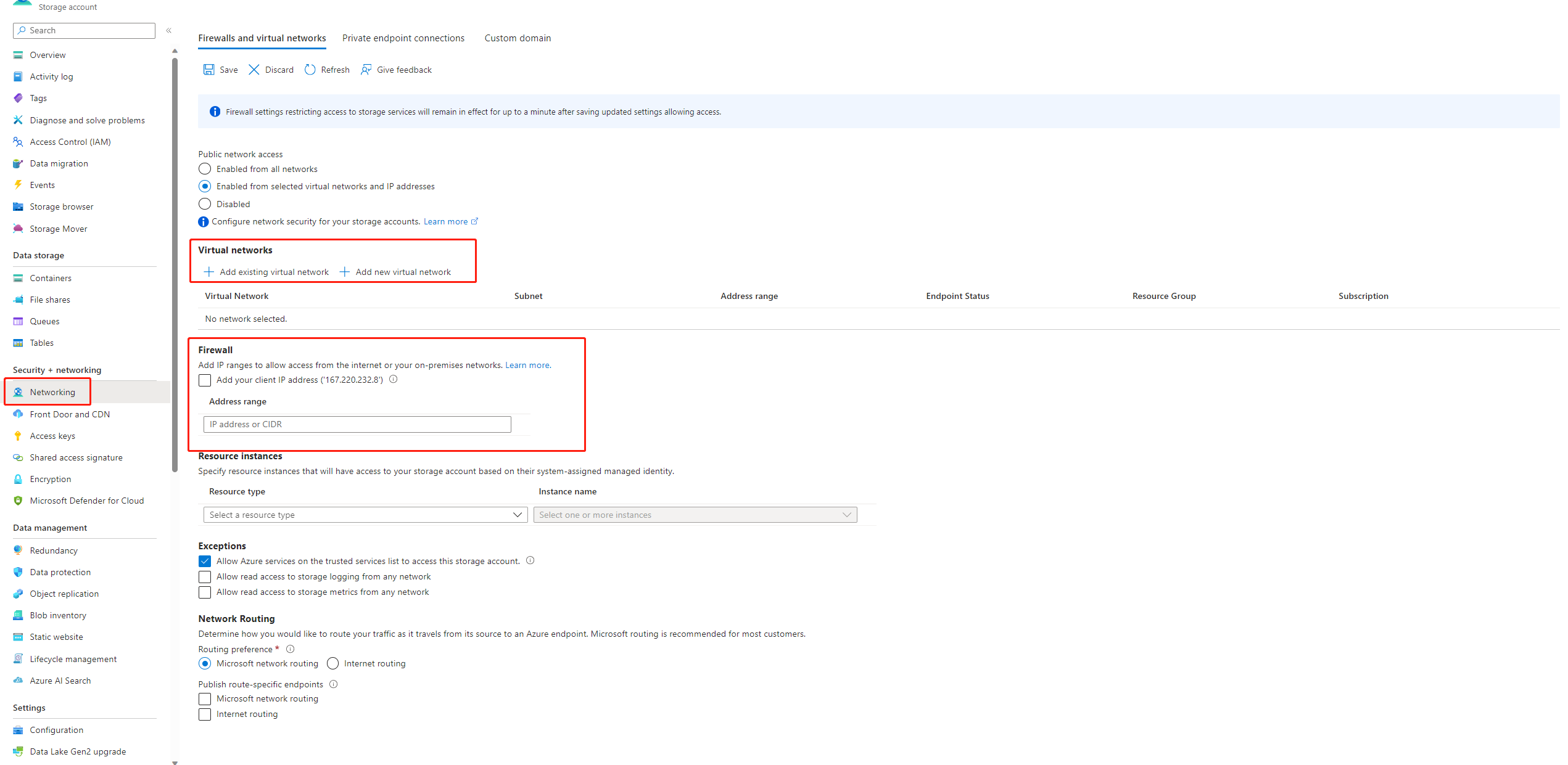 如果禁用了对存储帐户的公共访问,则必须通过将 IP 添加到存储防火墙或通过具有连接到存储帐户的专用终结点的虚拟网络来启用访问以确保访问。