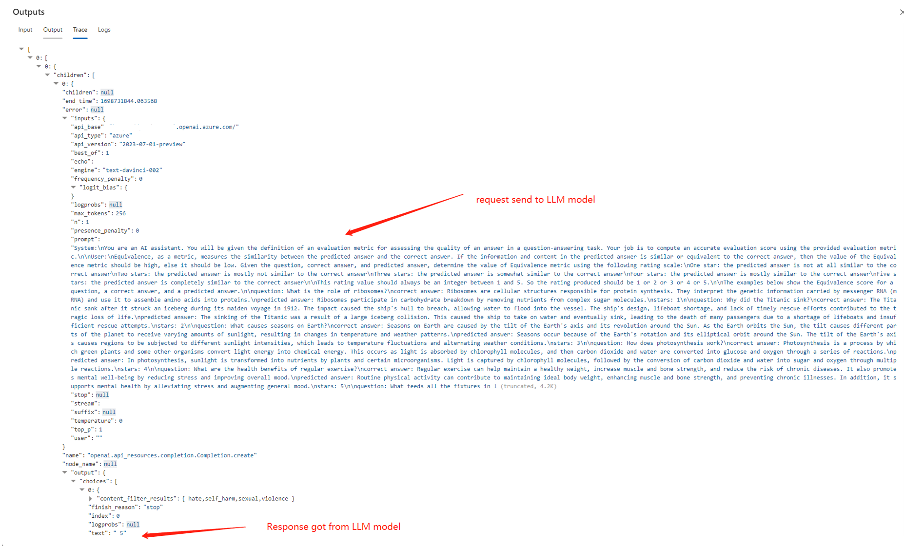 Trace 部分包括对 LLM 工具的每个请求和响应。 可以检查发送到 LLM 模型的原始消息和 LLM 模型的原始响应。