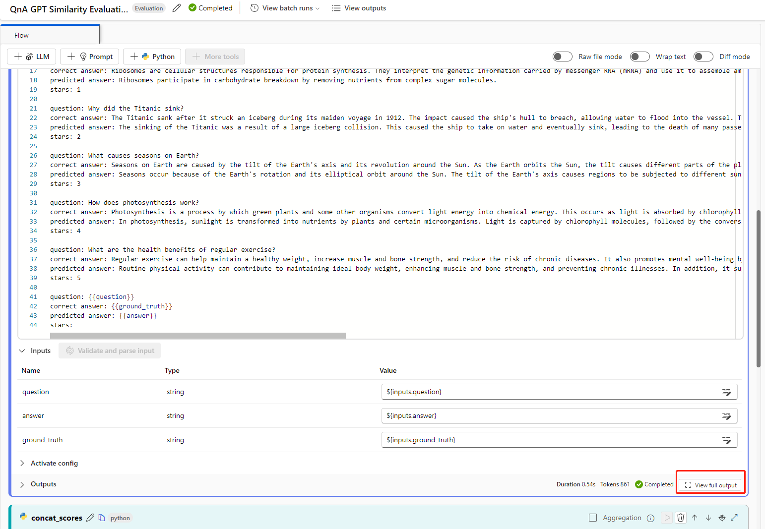 在提示流中,在成功运行的流页面和运行详细信息页面上,可以在输出部分找到 LLM 工具的原始输入和输出。 选择 view full output 按钮以查看完整输出。