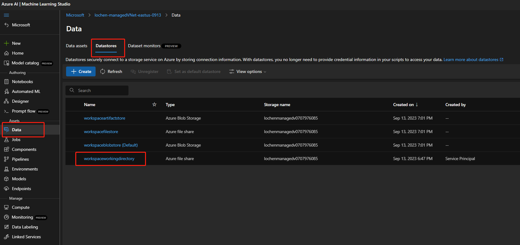 没有授权,无法执行操作“Microsoft.MachineLearningService/workspaces/datastores/read”