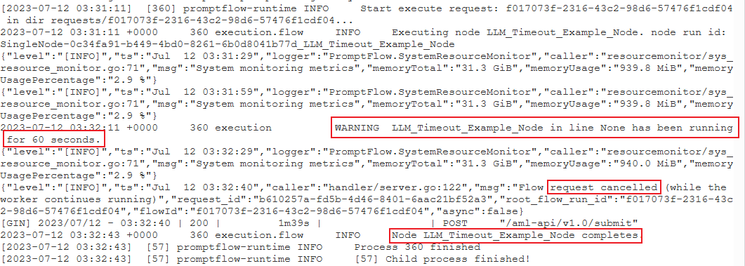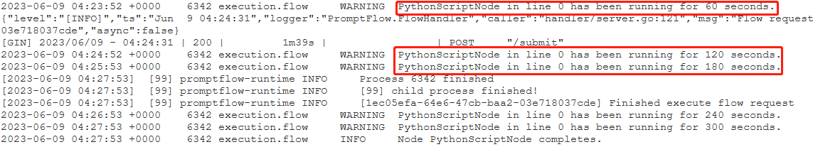 PythonScriptNode运行时间过长(大约 300 秒)。 然后,可以检查该节点详细信息,查看问题出在哪里。案例 2:LLM 节点长时间运行。