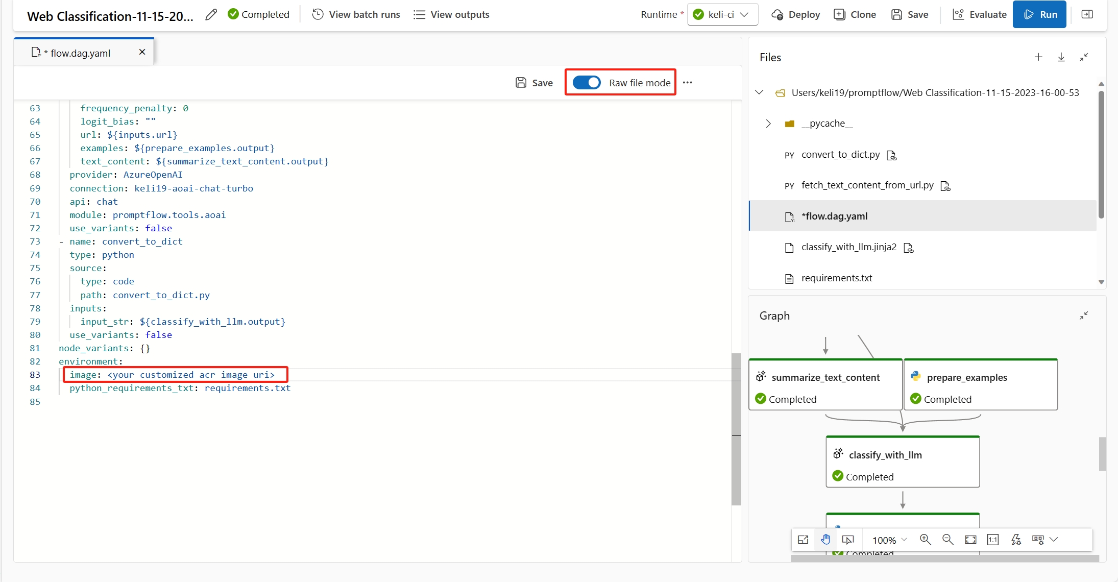 选择“原始文件模式”以切换到原始代码视图。 然后打开 flow.dag.yaml 文件。