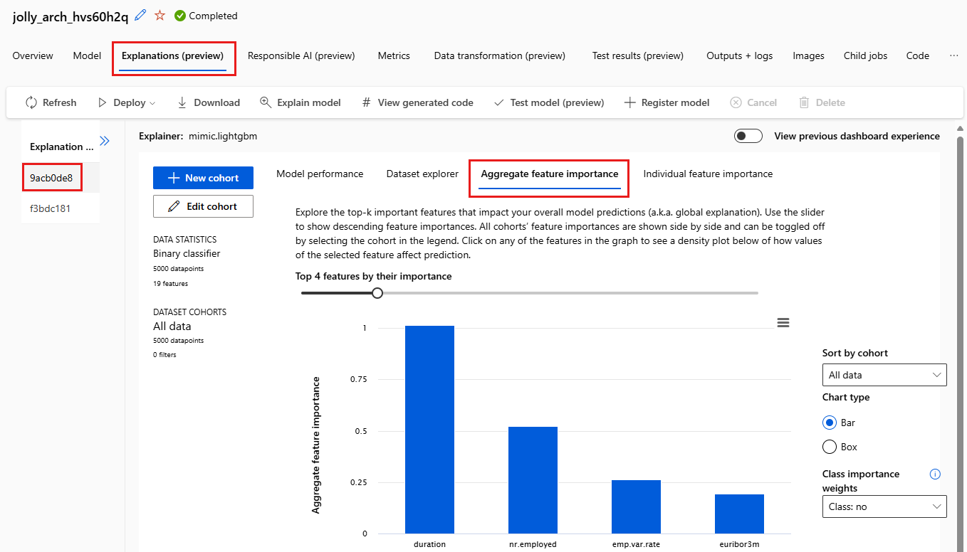 选择聚合特征重要性选项卡。此图表显示哪些数据特征影响了所选模型的预测。