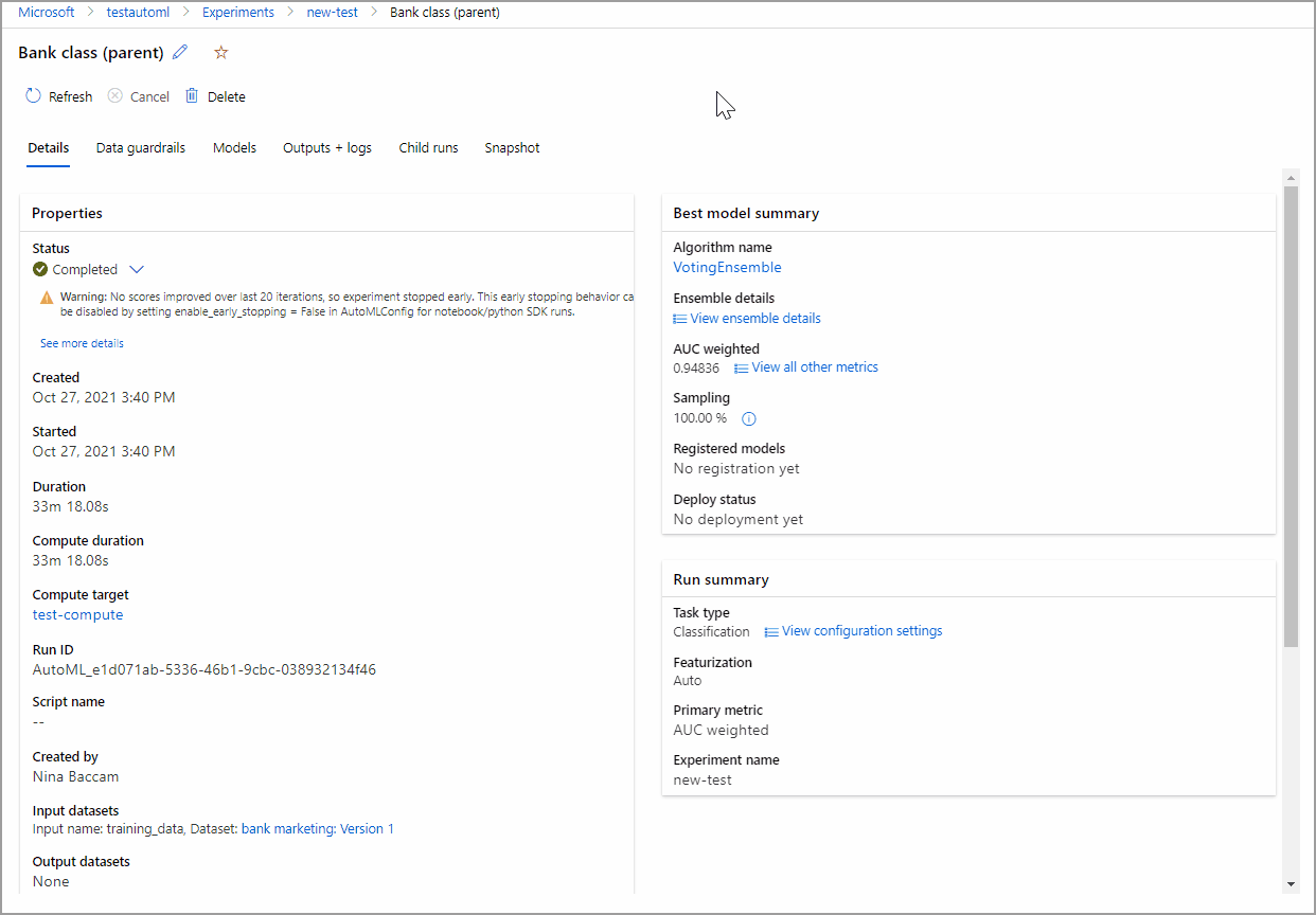 试验运行完成后,详细信息页中会填充最佳模型摘要部分。 在此试验上下文中,根据 AUCWeighted 指标,VotingEnsemble 被视为最佳模型。