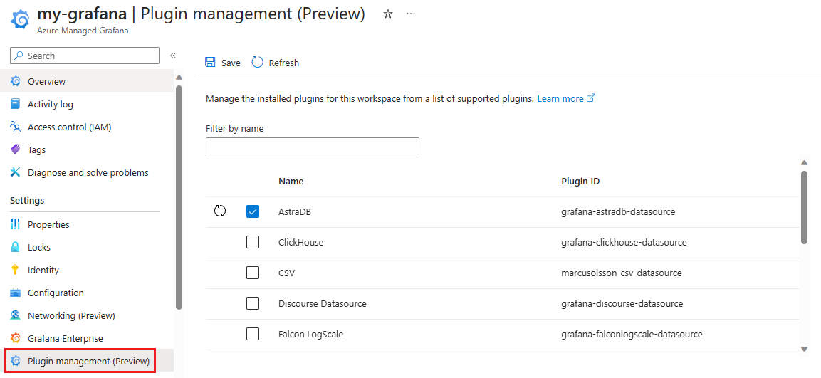 在此阶段,无法从 Grafana UI 或 Azure CLI 安装和删除插件。 插件管理是通过 Azure 门户中的 Azure 托管 Grafana 工作区完成的。