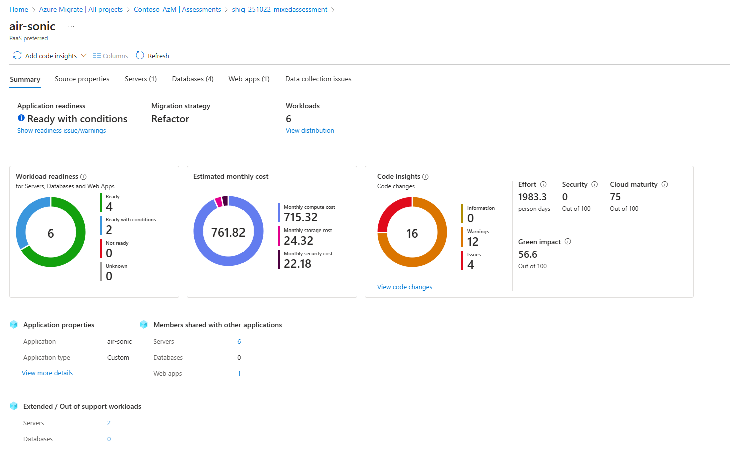 可以选择应用程序来详细分析每个应用程序。 详细向下钻取可用于识别就绪情况、适当大小的目标、源属性、迁移工具、在 Azure 上托管源的估计成本、迁移指南和建议推理,这些工作负荷是评估的一部分。