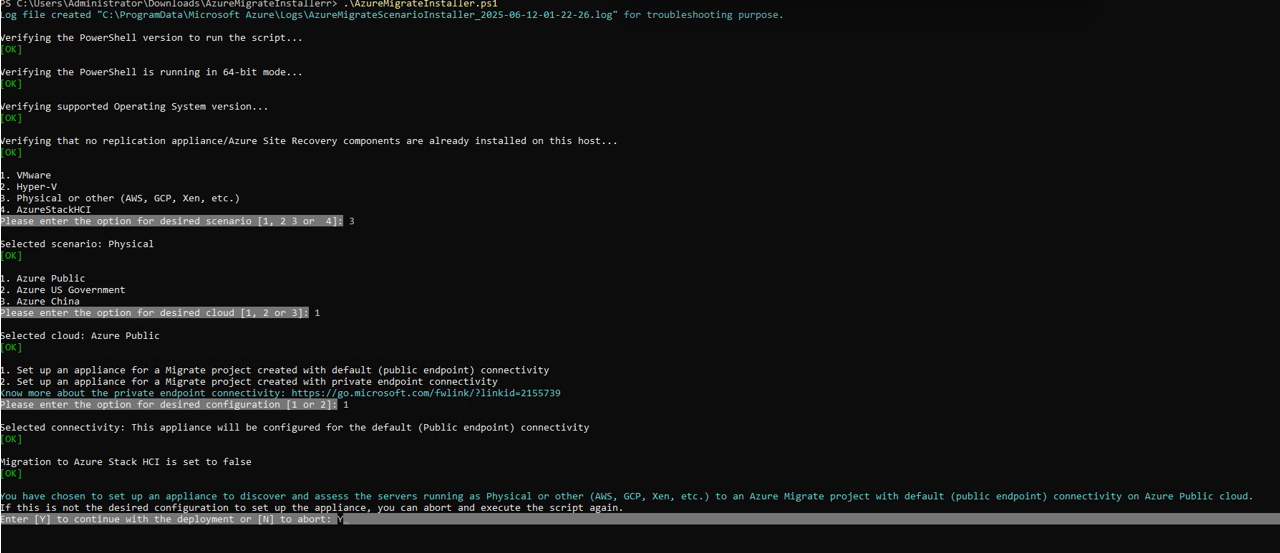 AzureMigrateInstaller.ps1的脚本:PS C:\Users\administrator\Desktop\AzureMigrateInstaller> .\AzureMigrateInstaller.ps1从场景、云和连接选项中进行选择,以部署具有所需配置的设备。 例如,下面所示的选择会在 Azure 公有云上已建立默认(公共终结点)连接的 Azure Migrate 项目中,设置一个设备,用于发现和评估物理服务器(或在 AWS、GCP、Xen 等其他云上运行的服务器)。