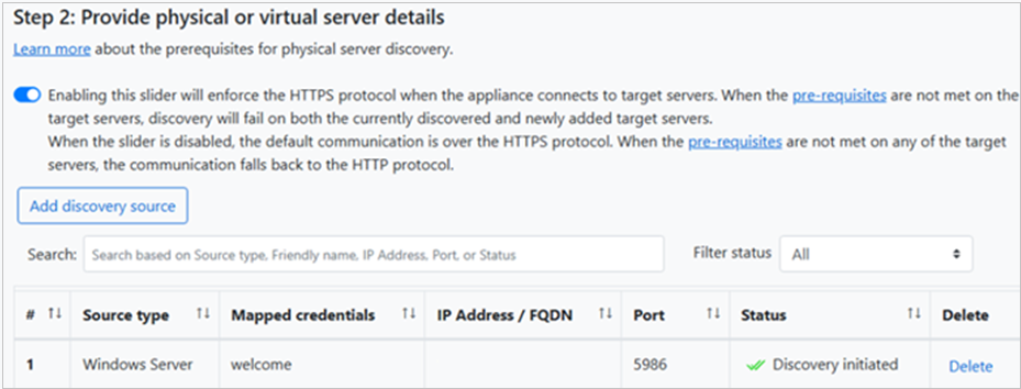 发现开始后,可以通过在 “添加发现源 ”表中搜索服务器名称并选择“ 删除”,从设备配置管理器中删除任何添加的服务器。
