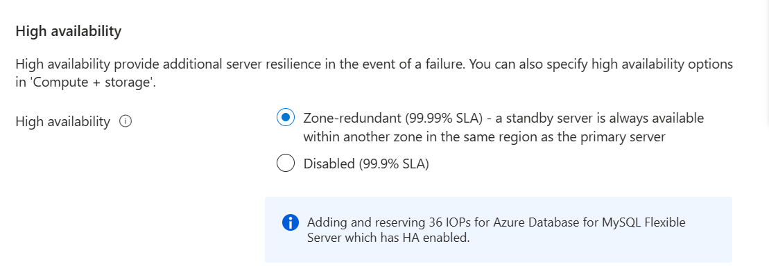 在“Azure Database for MySQL 灵活服务器实例”页上,选择前面板中的“高可用性”以打开“高可用性”页。