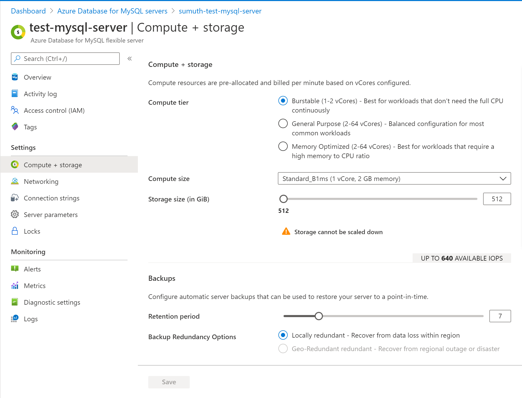 在 Azure 门户中,选择 Azure Database for MySQL。 在“设置”部分中,选择“计算 + 存储”。
