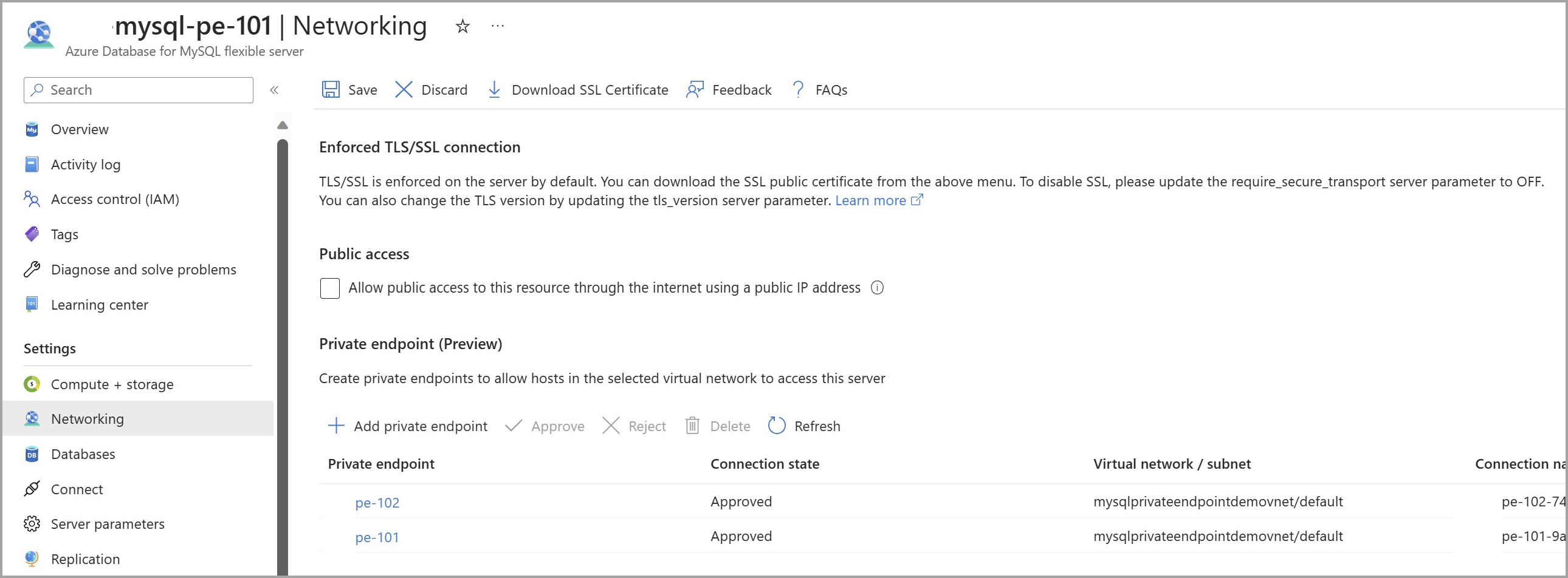 要求:服务器部署了连接 公共访问(允许的 IP 地址)和专用终结点。