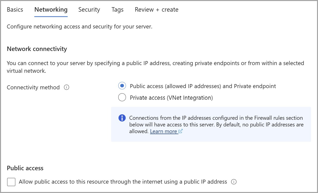 Public access (allowed IP addresses)并Private endpoint作为连接方法。若要在创建的 Azure Database for MySQL 灵活服务器实例上禁用公共访问,请取消选中“允许通过 Internet 使用公共 IP 地址
