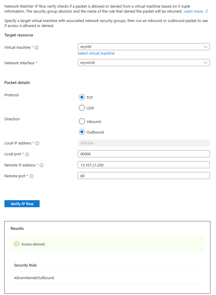 IP 流验证检查Azure默认和配置的安全规则。 如果检查返回预期的结果,而网络问题仍然存在,请确保在虚拟机和要与之通信的终结点之间没有防火墙,且虚拟机中的操作系统没有会拒绝通信的防火墙。