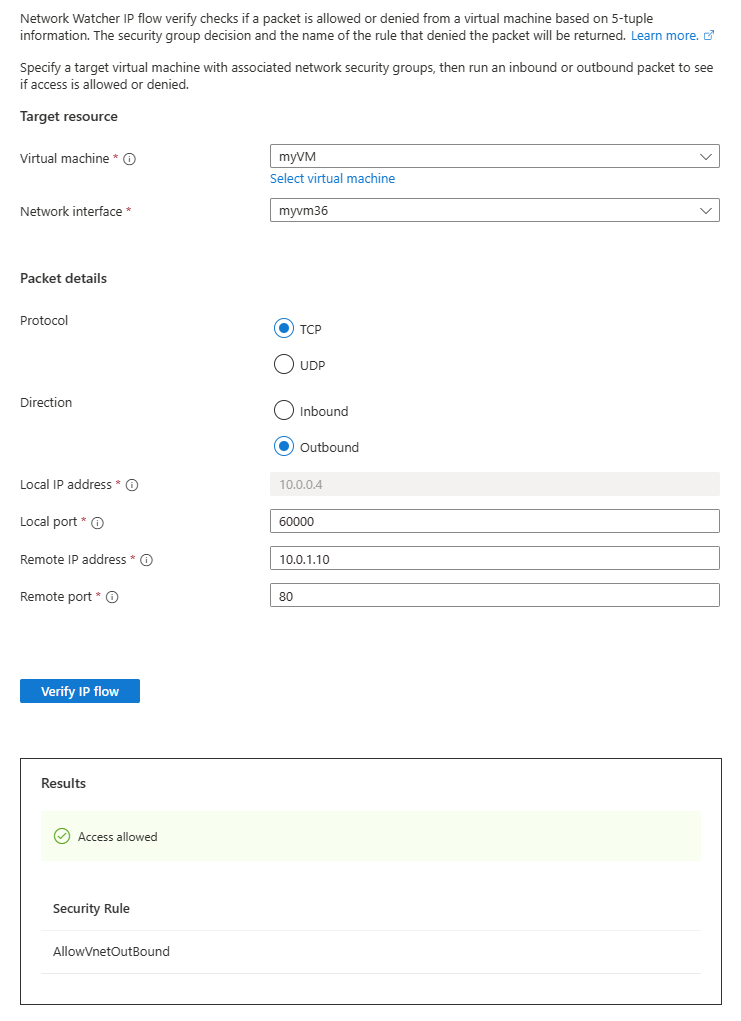 将远程 IP 地址更改为 10.0.1.10,这是 myVNet 地址空间中的专用 IP 地址。 然后选择“验证 IP 流”按钮重复测试。 第二次测试的结果指示,由于默认安全规则 AllowVnetOutBound,允许访问 10.0.1.10。