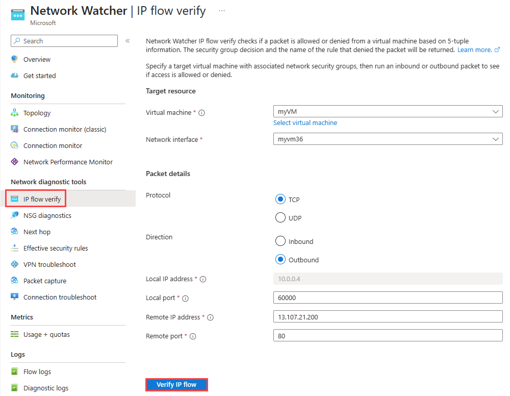在本部分中,你将使用Network Watcher的 IP 流验证功能来测试与虚拟机之间的网络通信。