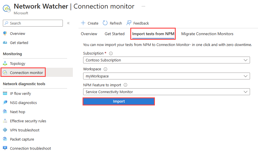 在 Network Watcher 中,选择 Connection monitor,然后选择 从 NPM 导入测试 选项卡。