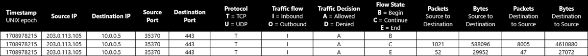 1708978215,203.0.113.105,10.0.0.5,35370,443,T,I,A,B,,,, 1708978215,203.0.113.105,10.0.0.5,35370,443,T,I,A,C,1021,588096,8005,4610880 1708978215,203.0.113.105,10.0.0.5,35370,443,T,I,A,E,52,29952,47,27072
