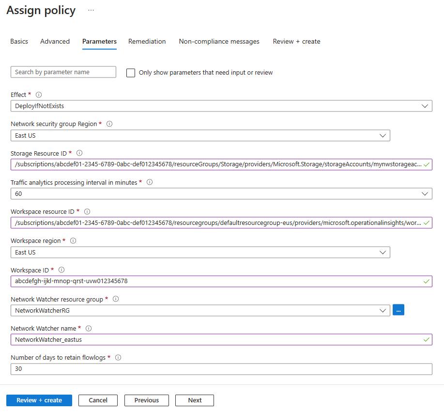 配置网络安全组以启用流量分析:此策略与前一策略类似,只是在修正期间,不会覆盖已启用流日志但使用策略分配中提供的参数禁用了流量分析的已标记网络安全组的流日志设置。