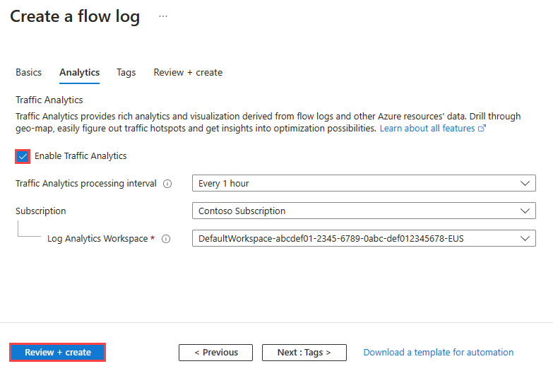 若要启用流量分析,请选择“下一步: 分析”按钮,或选择“分析”选项卡。输入或选择下列值: