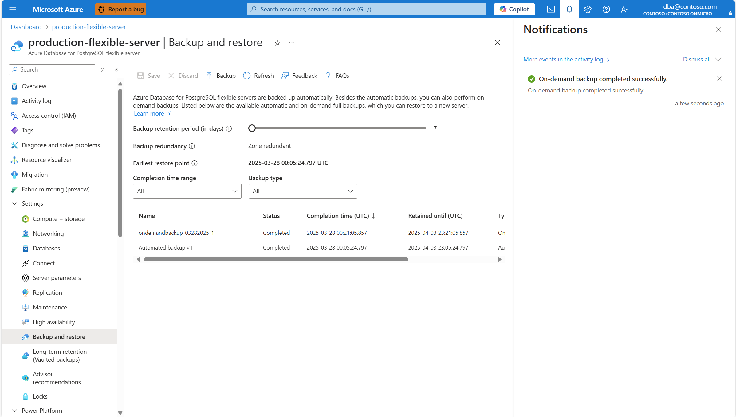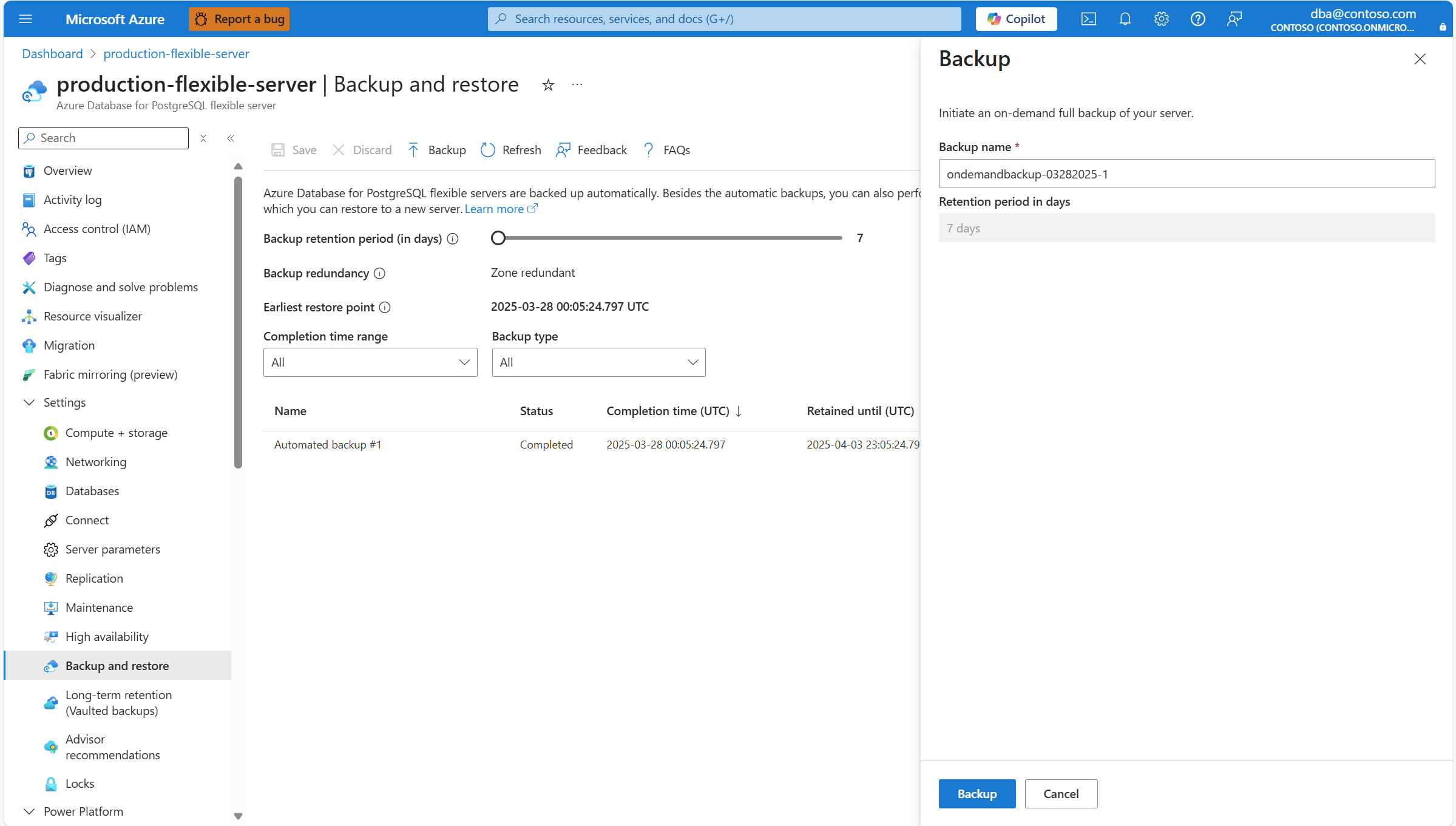 本文提供对 Azure Database for PostgreSQL 灵活服务器执行按需备份的分步说明。