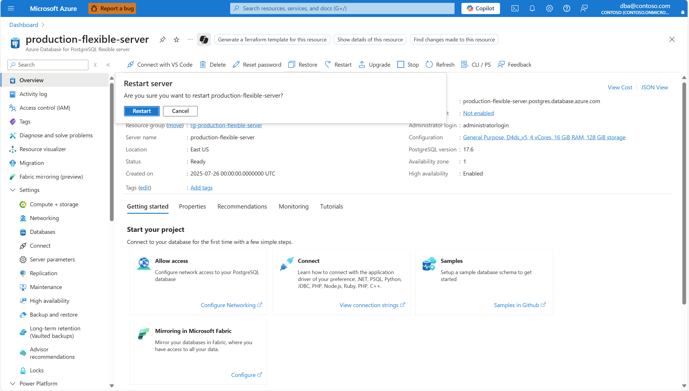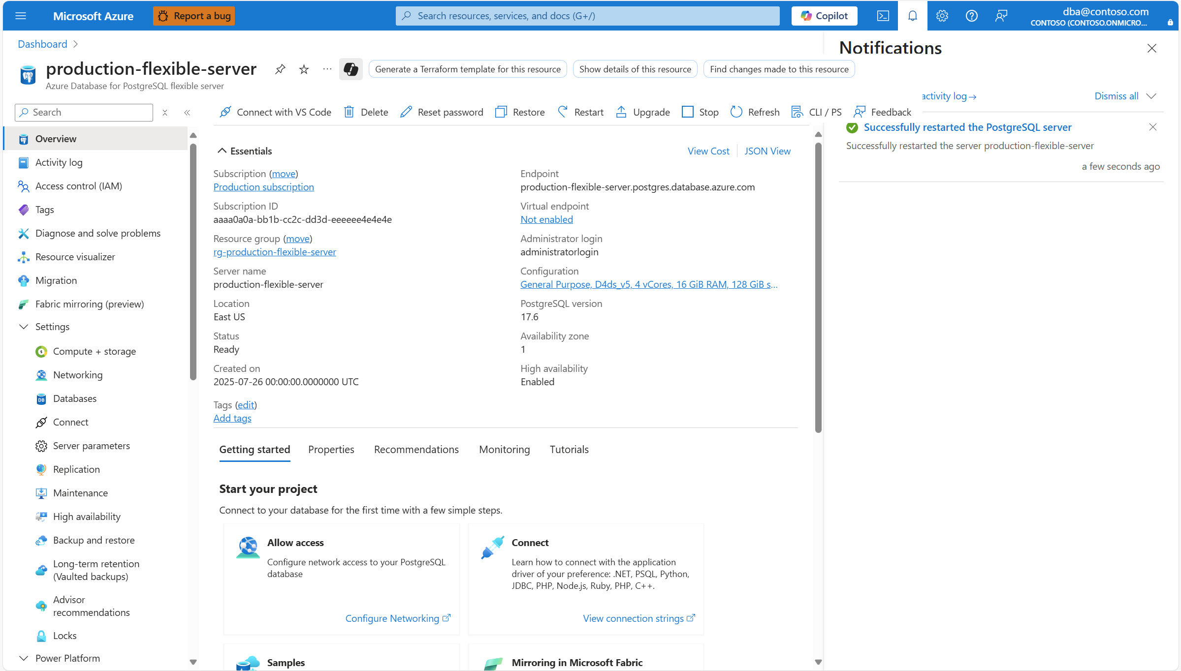 重启服务器后,Azure Database for PostgreSQL 灵活服务器可以进行所有管理操作。
