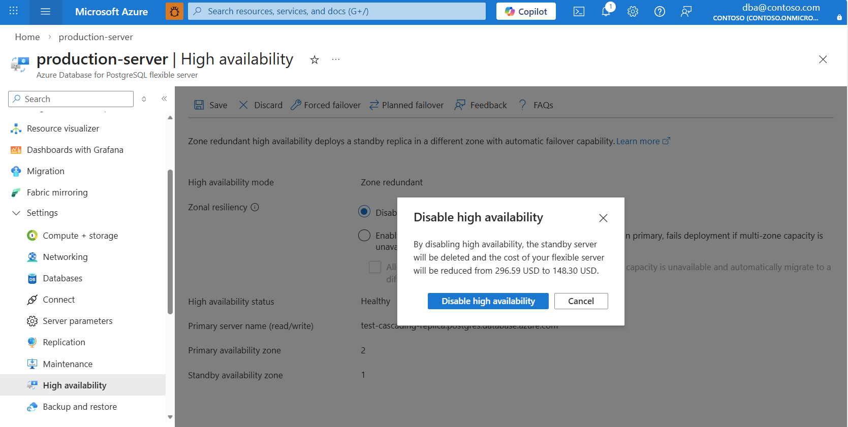 不再需要保护备用副本时,可以在Azure Database for PostgreSQL灵活服务器实例上禁用高可用性。 禁用高可用性会删除备用服务器并降低成本,但服务器不再受到区域或服务器故障的保护。