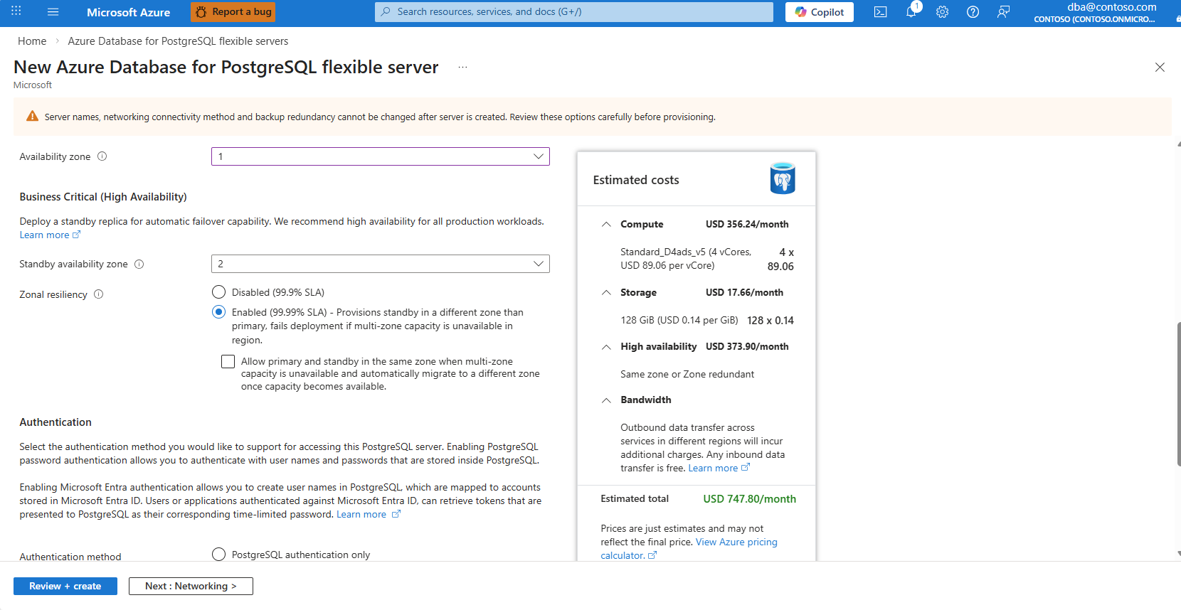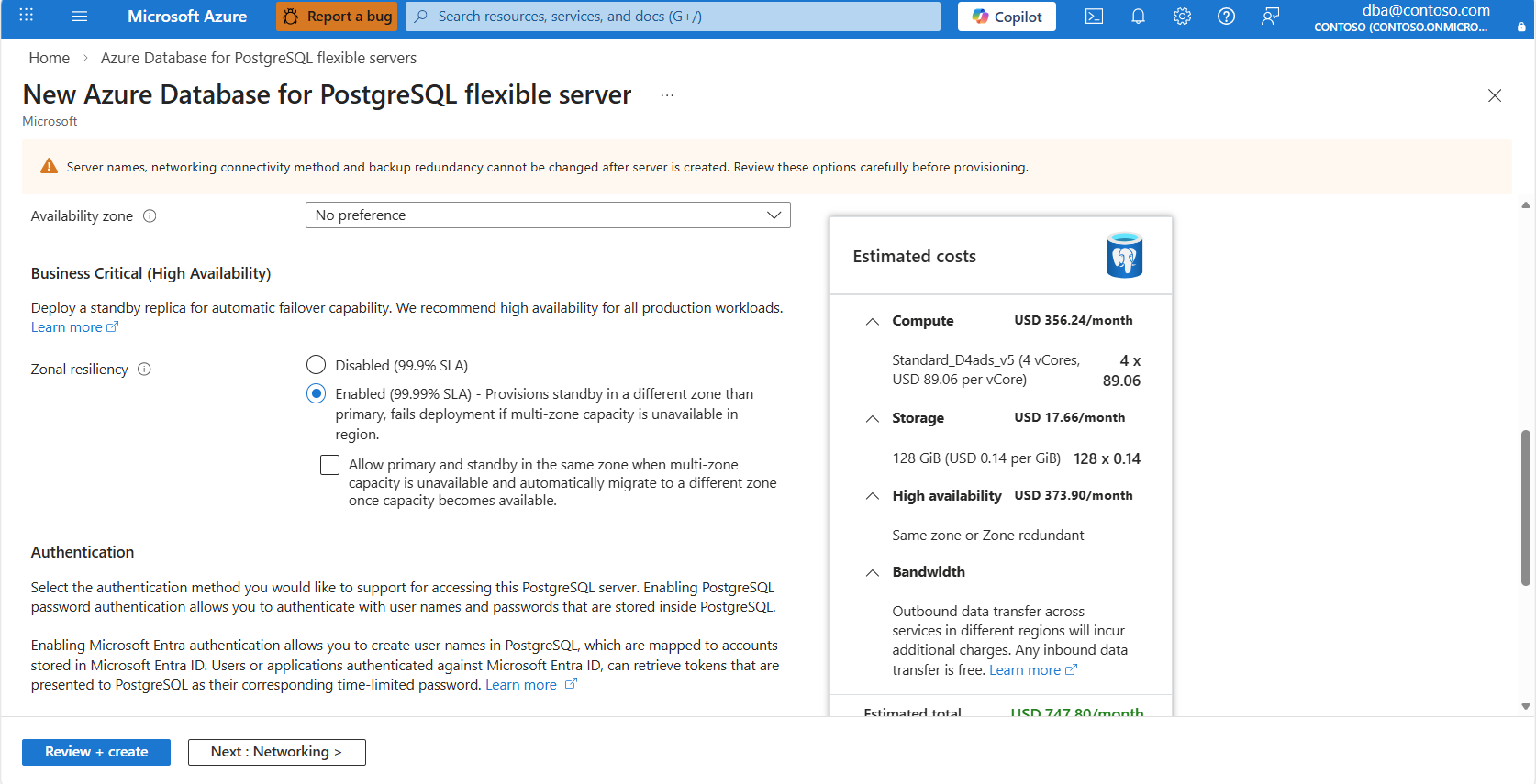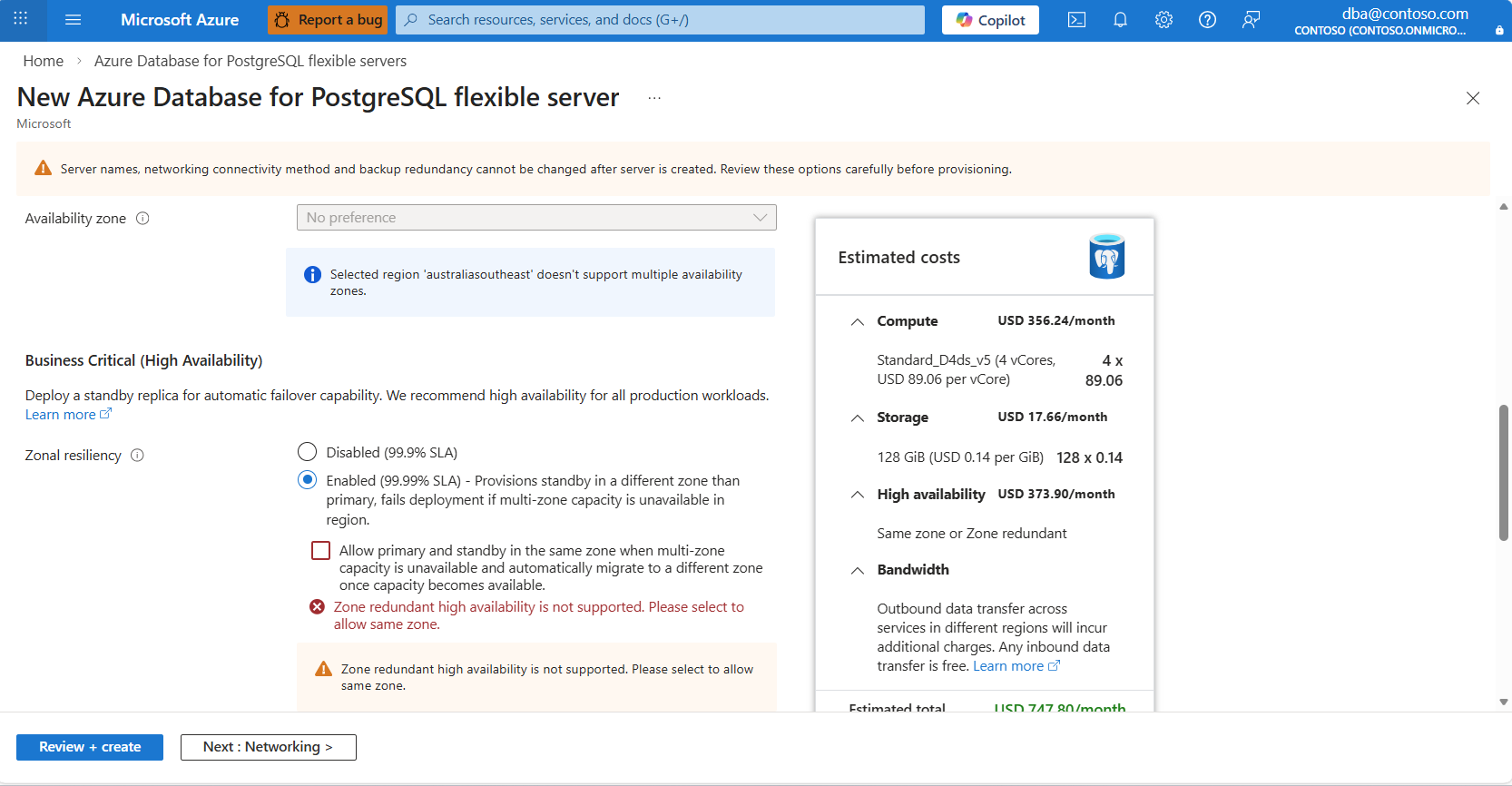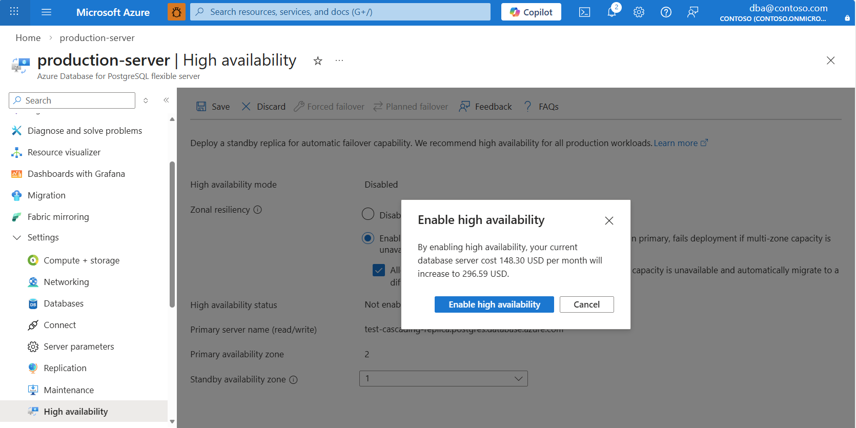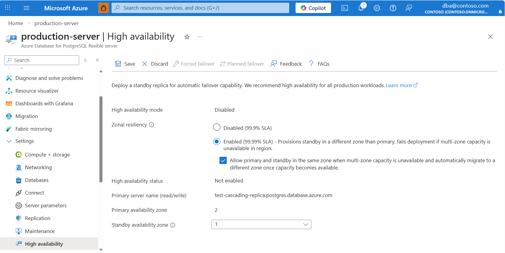 • 如果你在包含单个可用性区域的地区中部署服务器,则只能在“同一区域”模式下启用高可用性。 如果将来使用多个availability zones增强区域,则可以部署具有高可用性且配置为同一区域或区域冗余的新Azure Database for PostgreSQL灵活服务器实例。