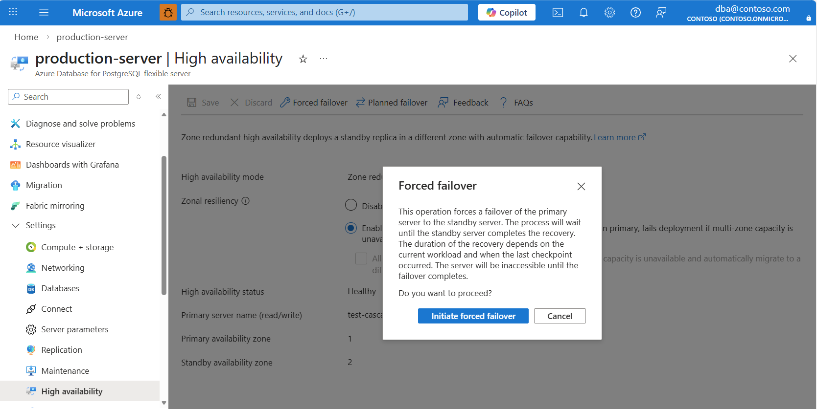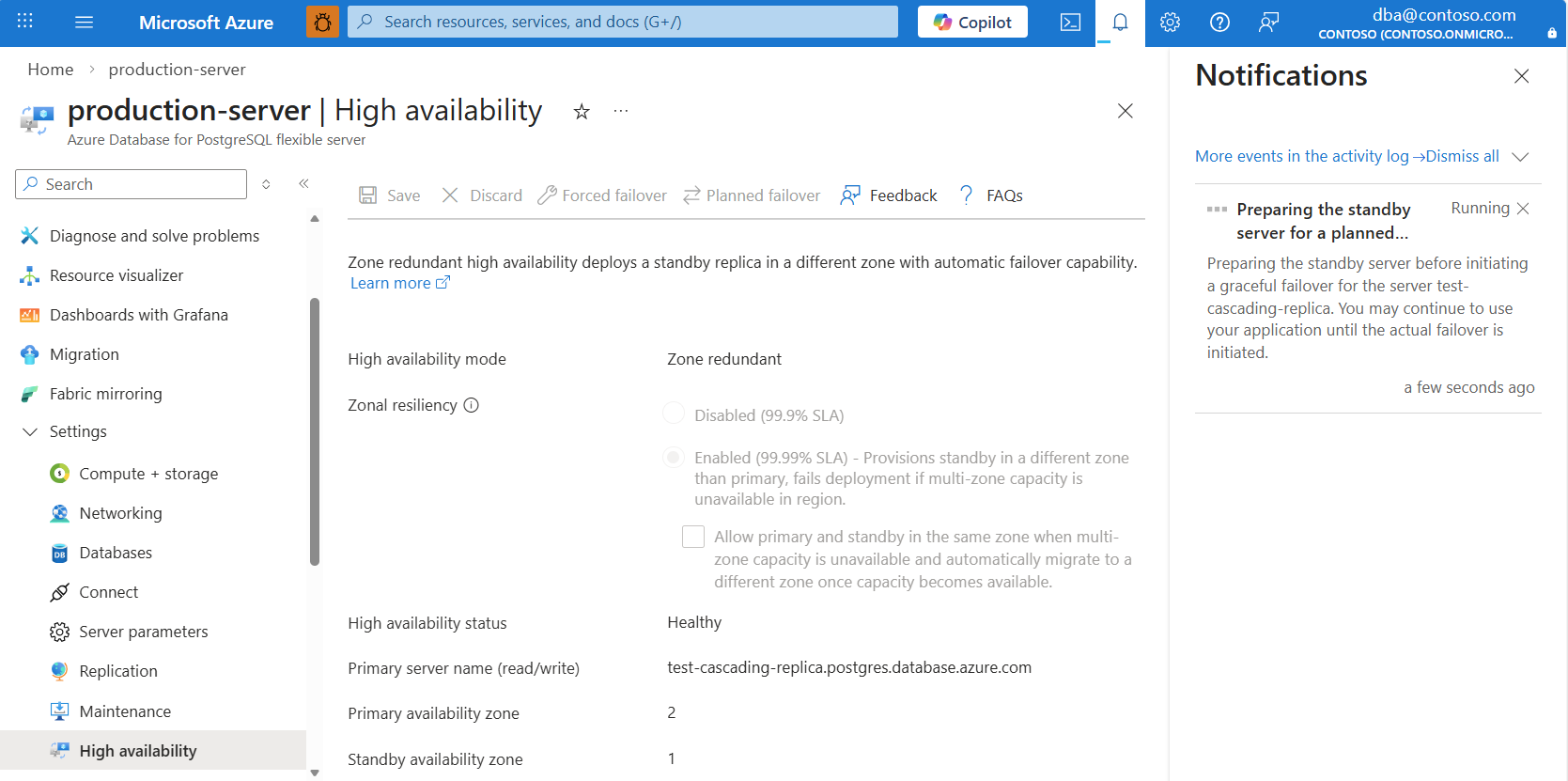 请按照以下步骤在 Azure Database for PostgreSQL 中执行计划故障转移,从主服务器切换到备用服务器。 启动此操作会准备备用服务器,然后执行故障转移。
