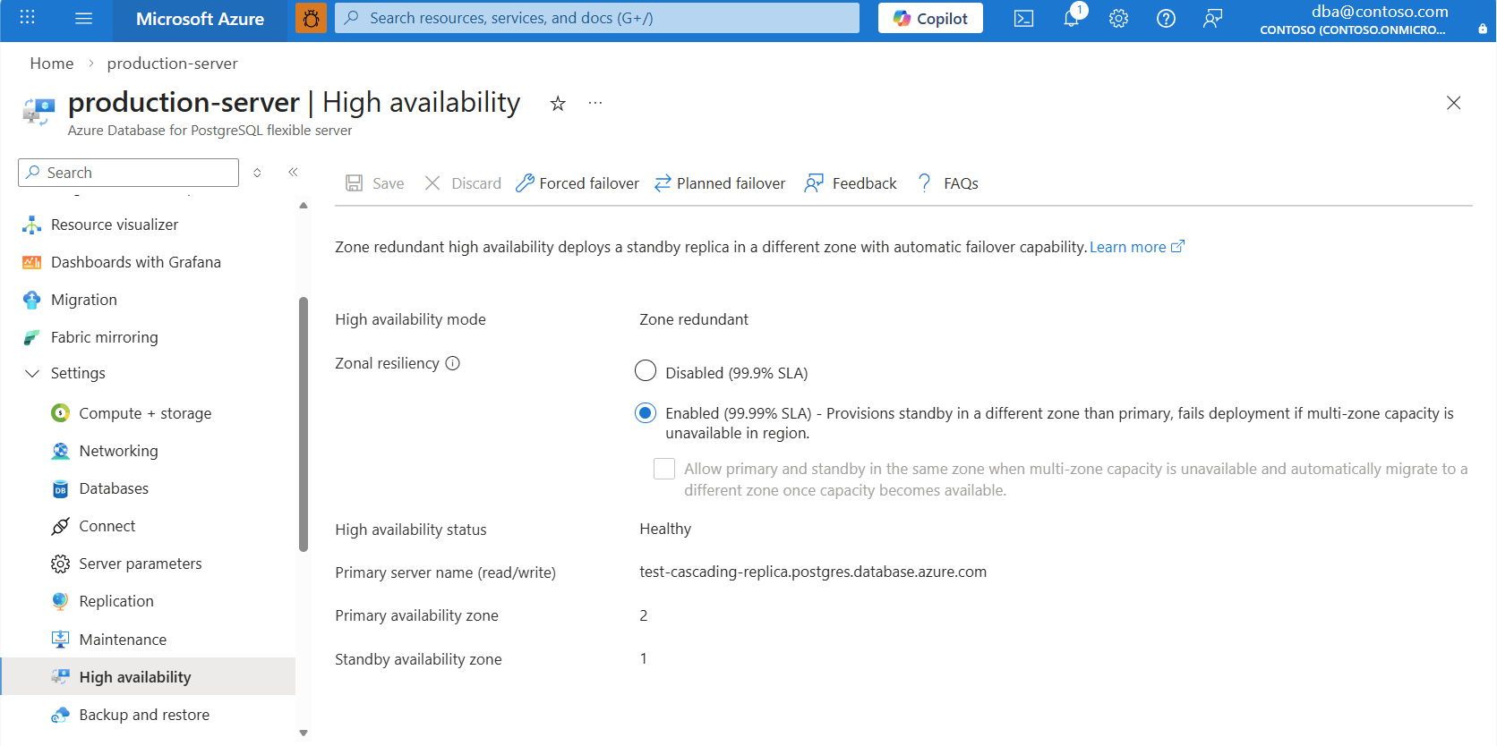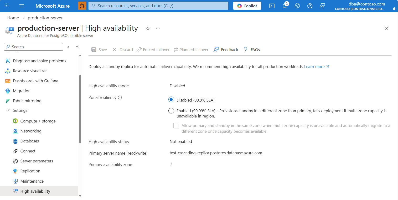 1. Azure portal 中,选择启用了高可用性的 Azure Database for PostgreSQL 灵活服务器实例。