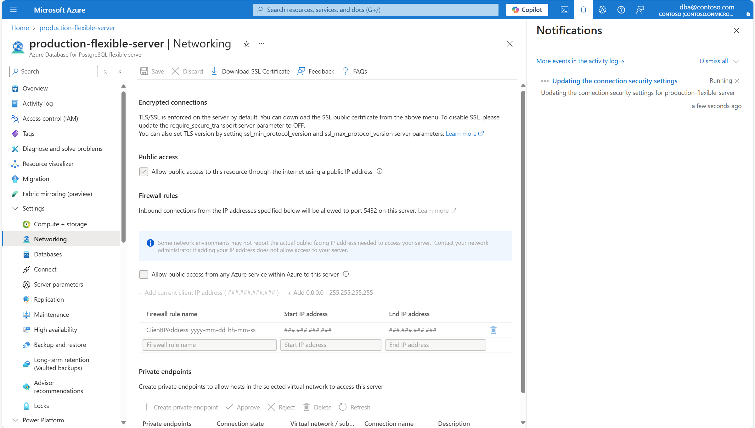 启用公共访问后,可以配置防火墙规则,以允许源自特定 IP 地址或来自任何 Azure 服务的连接。