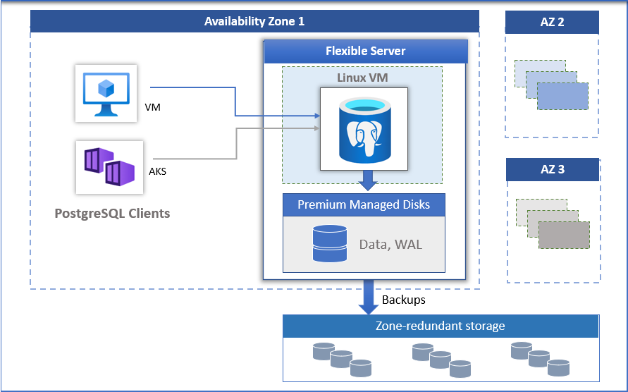 Azure Database for PostgreSQL 部署模型支持单个可用性区域中和跨多个可用性区域的高可用性。 该体系结构将计算和存储分开。 数据库引擎在 Linux 虚拟机内的容器上运行,而数据文件位于 Azure 存储上。 存储维护数据库文件的三个本地冗余同步副本,确保数据持续性。