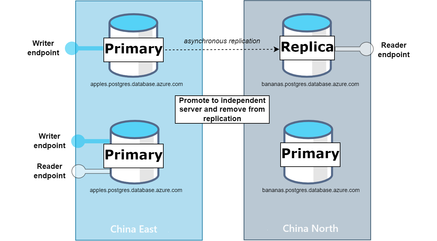 选择此选项时,副本将提升成为独立服务器并从复制过程中移除。 因此,主服务器和提升后的服务器都将充当两个独立的读写服务器。 应该注意的是,虽然可以配置虚拟终结点,但它们并不是此操作所必需的。 新提升的服务器不再是任何现有虚拟终结点的一部分,即使读取器终结点之前指向它。 因此,如果应用程序需要连接到新的副本,就必须更新应用程序的连接字符串,以指向新升级的副本。