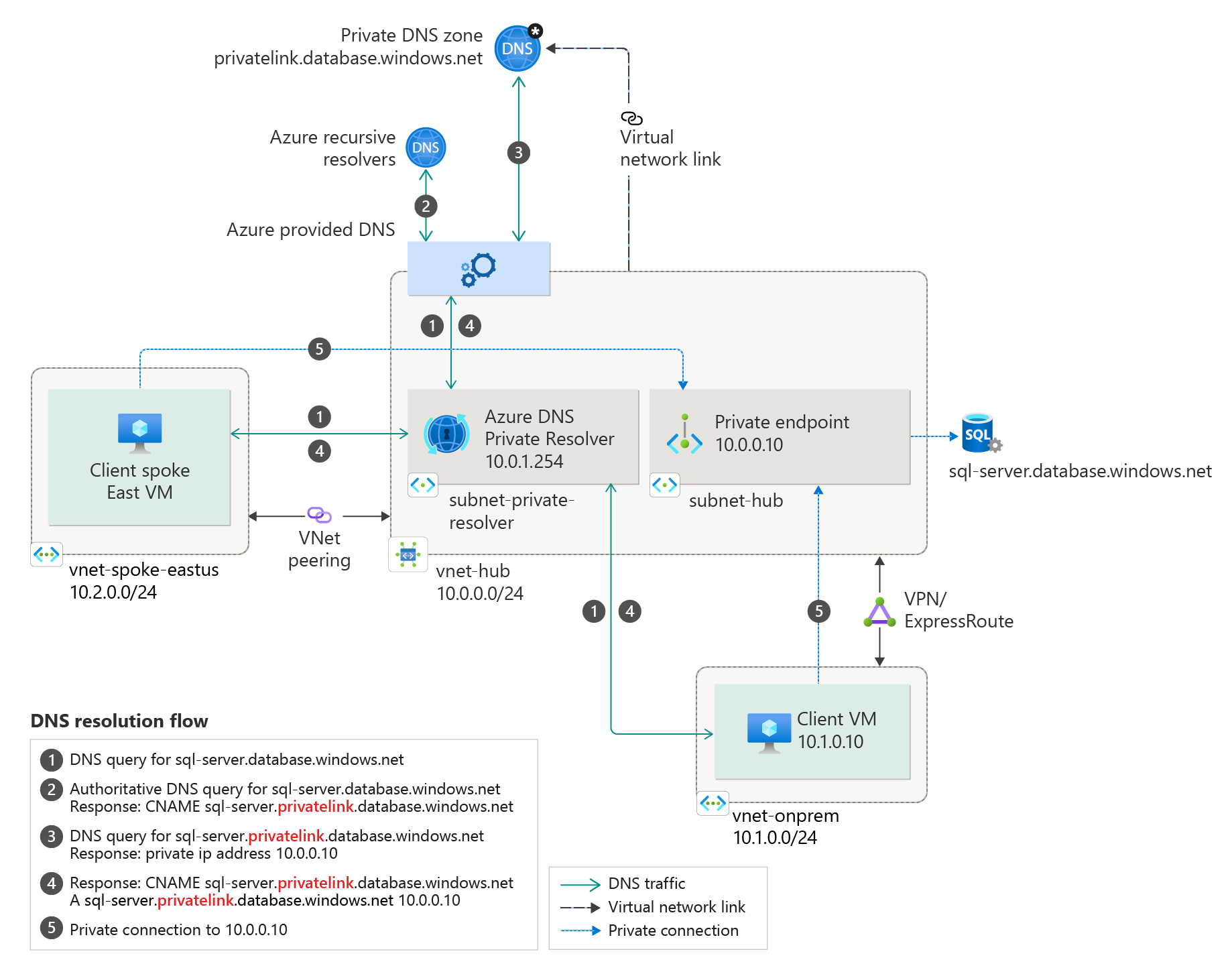 此配置需要使用单个专用 DNS 区域。 所有从本地和对等虚拟网络建立的客户端连接也必须使用同一专用 DNS 区域。