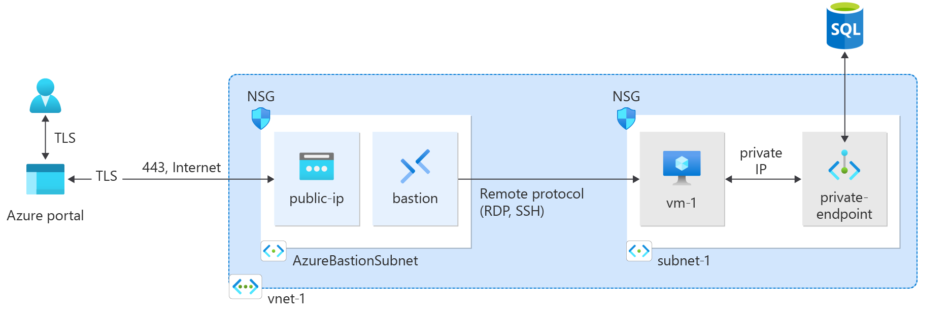 Bastion 使用浏览器通过安全外壳 (SSH) 或远程桌面协议 (RDP),通过使用其专用 IP 地址连接虚拟网络中的虚拟机。 虚拟机不需要公共 IP 地址、客户端软件或特殊配置。 有关详细信息,请参阅什么是 Azure Bastion?。